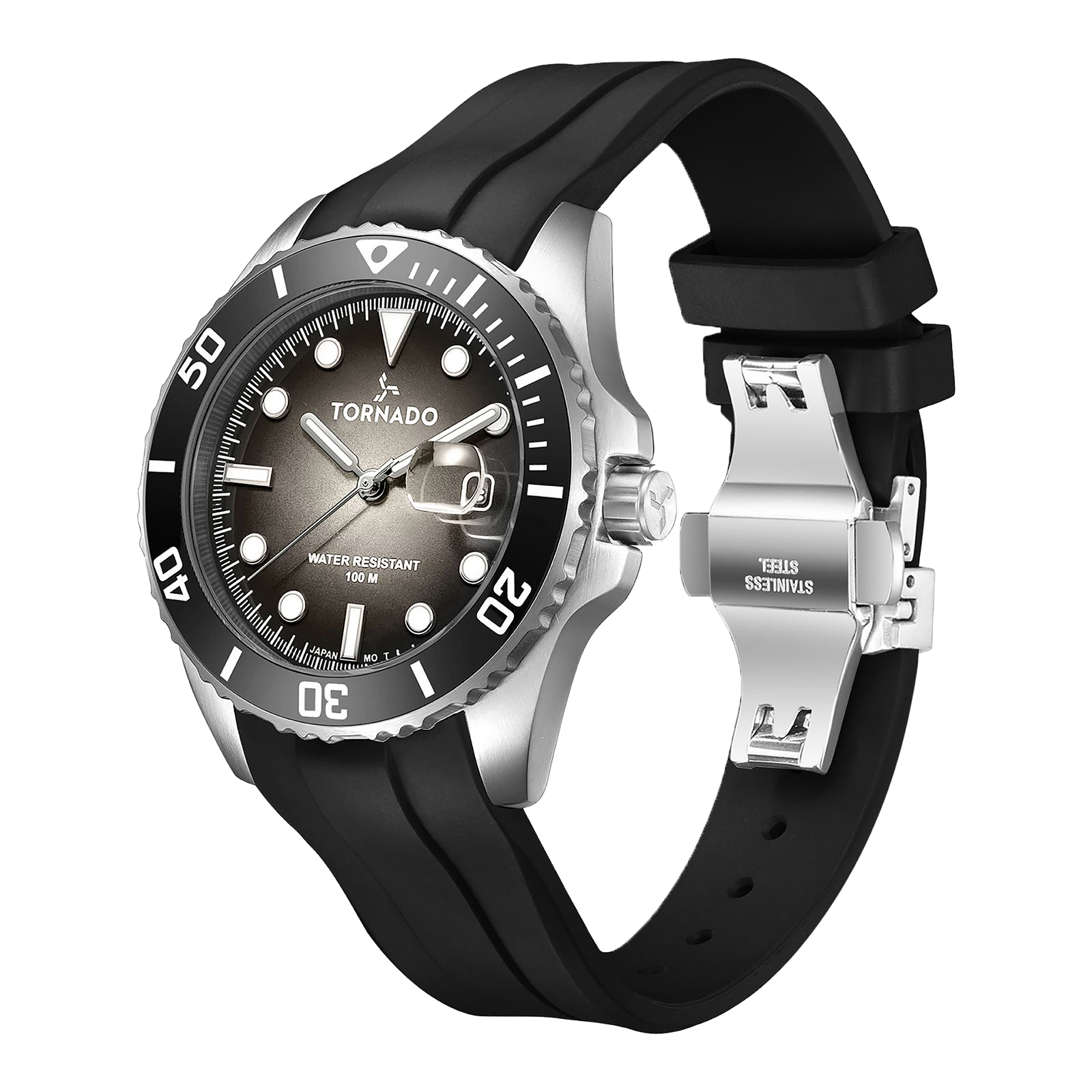 Classic dive DNA, modern monochrome. The Tornado Lumina analog men’s watch T22001-SSBB focuses on construction: a 316L stainless-steel case, a ceramic unidirectional bezel that turns with a confident click, and a sapphire-coated crystal over a refined smoke-grey/black gradient dial. A magnifying date boosts legibility at a glance, while bright lume keeps it readable after dark. Inside, the proven Miyota 2115 Japanese quartz movement runs quiet and precise—set it, wear it, forget it. Made for motion—and made to last. The black silicone strap wears light at the gym, on a run or ride, and looks sharp with weekend tees, hoodies and denim. Dress it up with a knit polo or button-down for casual Fridays. With 10 ATM water resistance and a 3-year warranty, it’s the luxury sport watch you can count on from commute to campsite and back again.
