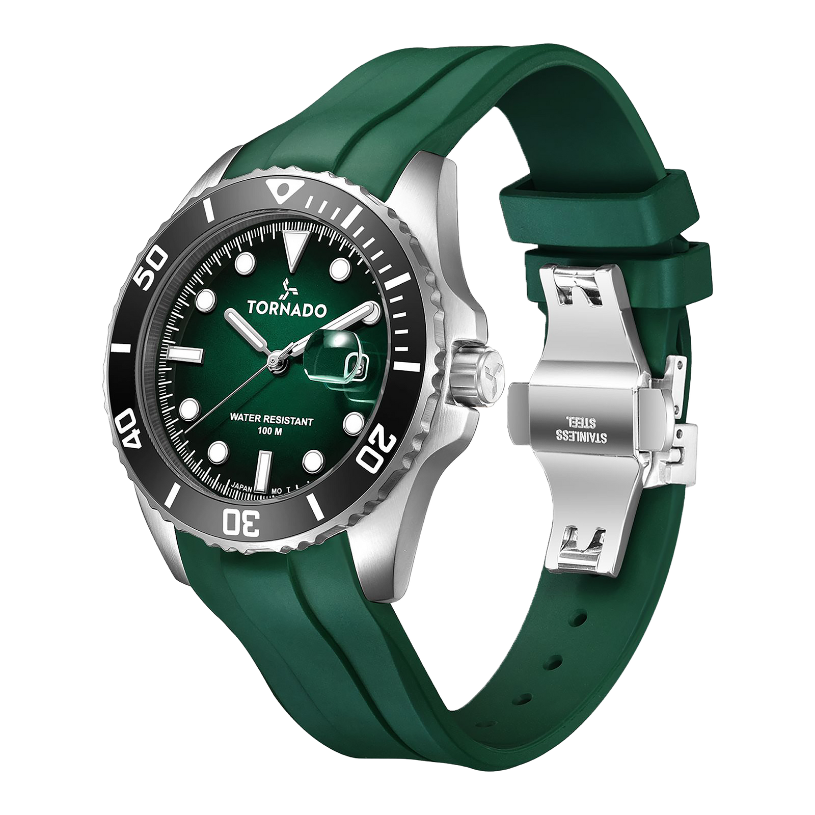Built for motion; finished like a classic. Tornado Lumina analog watch T22001-SSHH pairs a 316L stainless-steel case with a sapphire-coated crystal and a ceramic unidirectional bezel that turns with a confident click. The gradient green dial stays crisp in any light, amplified by a date magnifier and bright luminous index. Inside, Miyota 2115 Japanese quartz movement delivers quiet, dependable accuracy. Your go-anywhere sport companion. The high-grade silicone strap is soft, durable and ready for cycling, jogging, gym sessions, camping and casual weekends. Wear it with activewear, tees and hoodies or dress it up with a knit polo and denim—green pairs effortlessly with black, white, grey and khaki. With 10ATM water resistance and a 3-year warranty, it’s the clean, modern watch you’ll reach for every day.