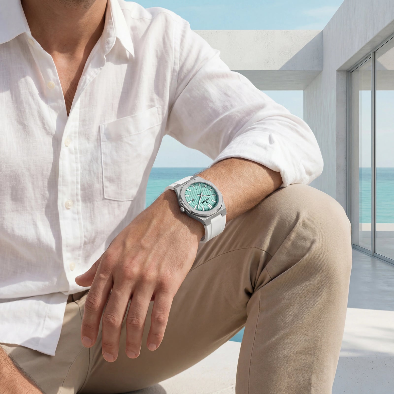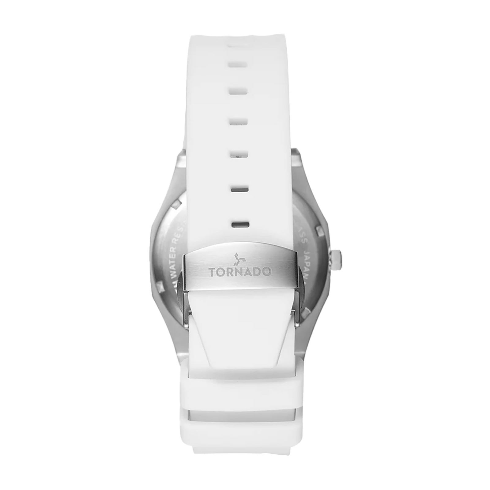 The Tornado SPECTRA in silver casing with a white silicone strap offers a lighter, more relaxed expression of the collection. The 40 mm case is made from solid 316L stainless steel, finished in clean silver tones and shaped by an octagonal bezel. A blue dial with horizontal striping brings controlled depth and contrast, adorned with luminous hands and index markers to ensure clear visibility in low light. A date display is snugly seated at three o’clock. Sapphire-coated glass protects the dial, keeping the surface clear through daily wear.The watch is fitted with a high-quality white silicone strap that is flexible, durable, and comfortable against the skin. It closes with a butterfly clasp for a secure, streamlined fit. Powered by the Japanese Miyota GM10 quartz movement and rated to 10 ATM, the SPECTRA is well suited to everyday use, travel, and light water activity. Backed by a three-year warranty, it delivers a clean, modern sports look with an easy, wearable feel.