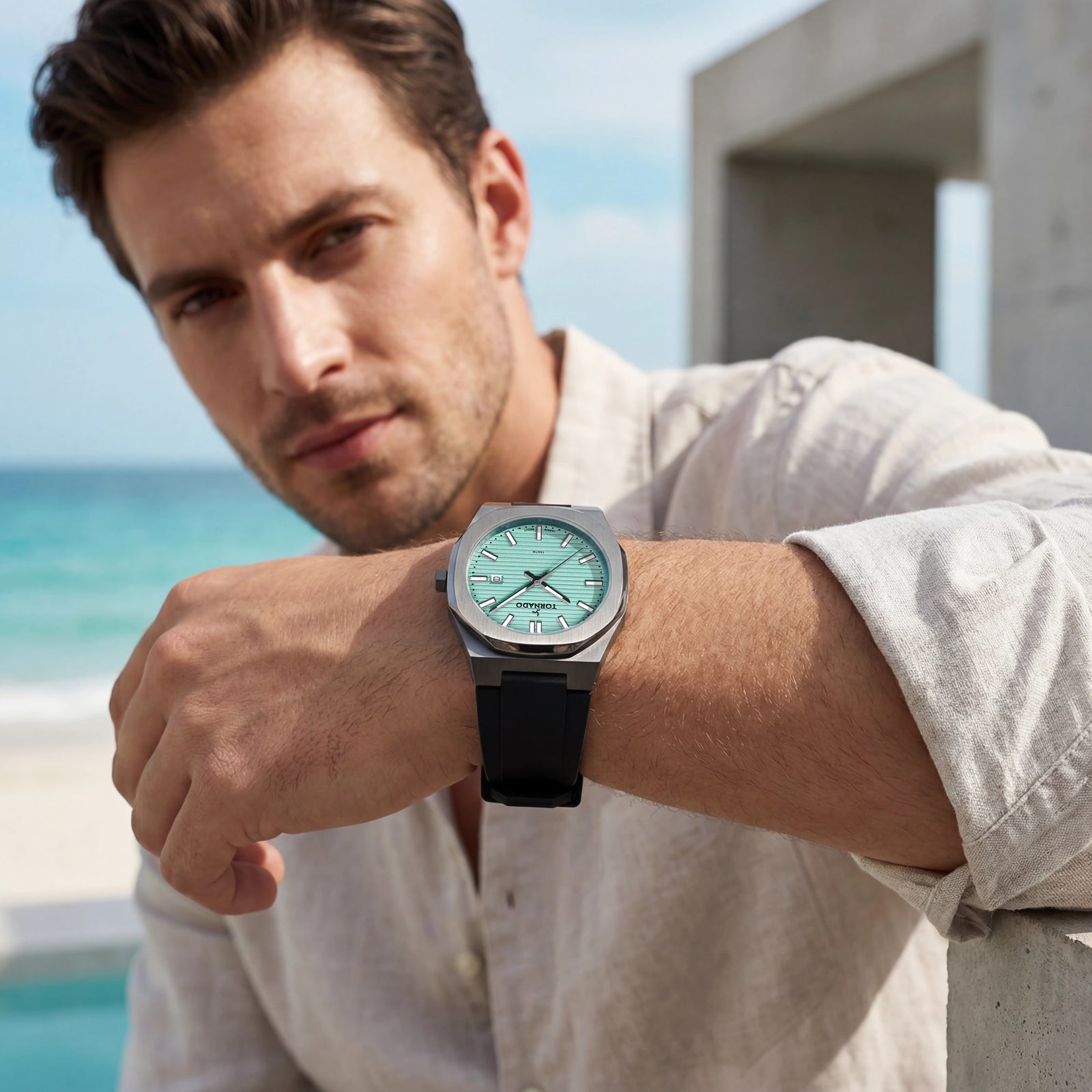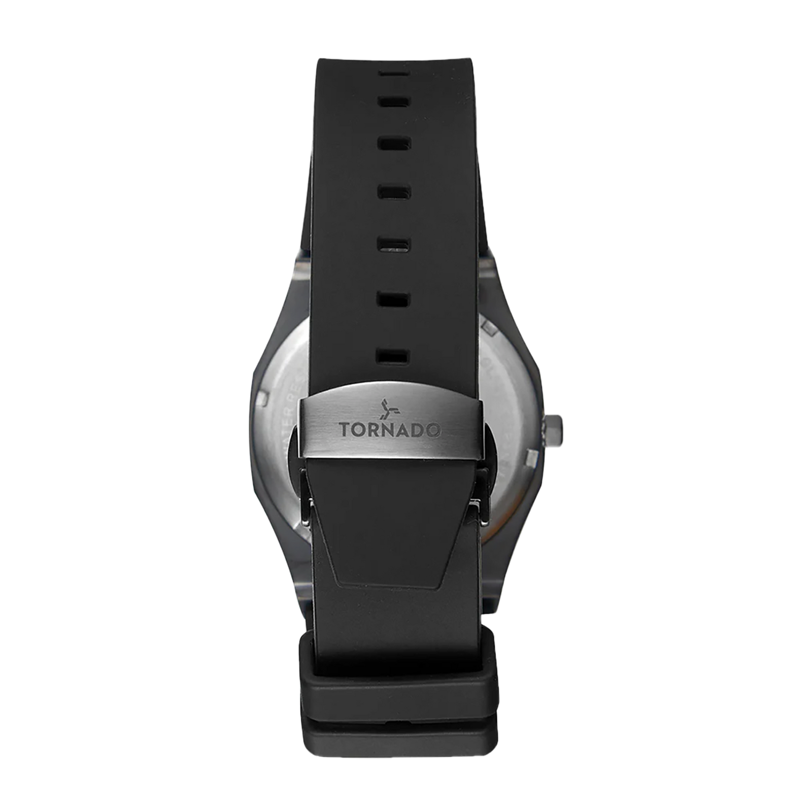The Tornado SPECTRA in grey sports a 40 mm case crafted from solid 316L stainless steel and finished in grey, giving the watch a muted, contemporary presence. A dial is blue toned with horizontal striping, while luminous hands and index markers keep the display readable in low light. The dial also holds a date window at three o’clock, integrated cleanly into the layout. The dial is guarded by Sapphire-coated glass, maintaining clarity and offering scratch and crack protection.Paired with a high-quality black silicone strap, the watch offers flexibility, durability, and comfort for daily use. Powered by the Japanese Miyota GM10 quartz movement and rated to 10 ATM, the SPECTRA is suited for active days, travel, and short water exposure. Backed by a three-year warranty, it combines modern restraint with practical performance.