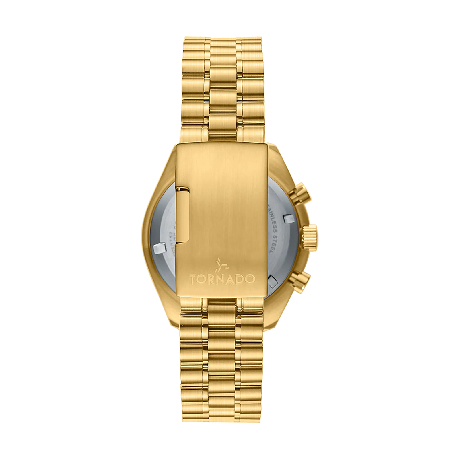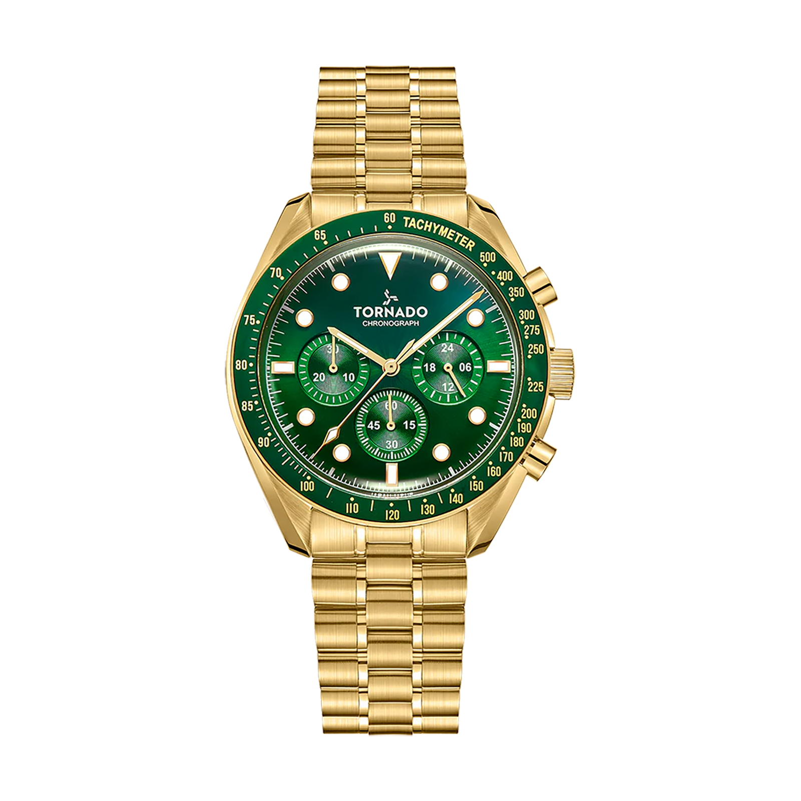 The Tornado COSMIC CHRONO brings a classic chronograph layout into a refined, modern frame. The round 42 mm case is crafted from solid 316L stainless steel and finished in rich gold tones, paired with a fixed aluminium tachymeter bezel that adds functional detail without visual excess. A green sunburst dial catches light with a smooth radial finish, anchored by luminous indices and hands for low light legibility. Chronograph sub-dials are arranged with balance and clarity, while the double-domed sapphire-coated crystal adds depth and protects the surface from daily wear. The gold-toned stainless-steel bracelet combines brushed outer links with polished center links and closes with a butterfly clasp for a clean, secure fit. Powered by the Japanese Miyota JS20 chronograph movement and rated to 10 ATM, the Cosmic Chrono is suited for everyday wear, travel, and short swims. Backed by a three-year warranty, it offers a measured blend of precision, presence, and endurance.