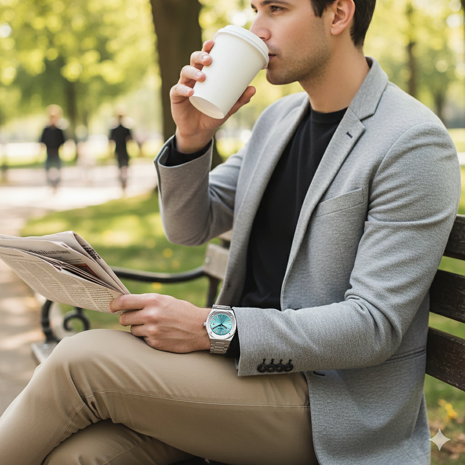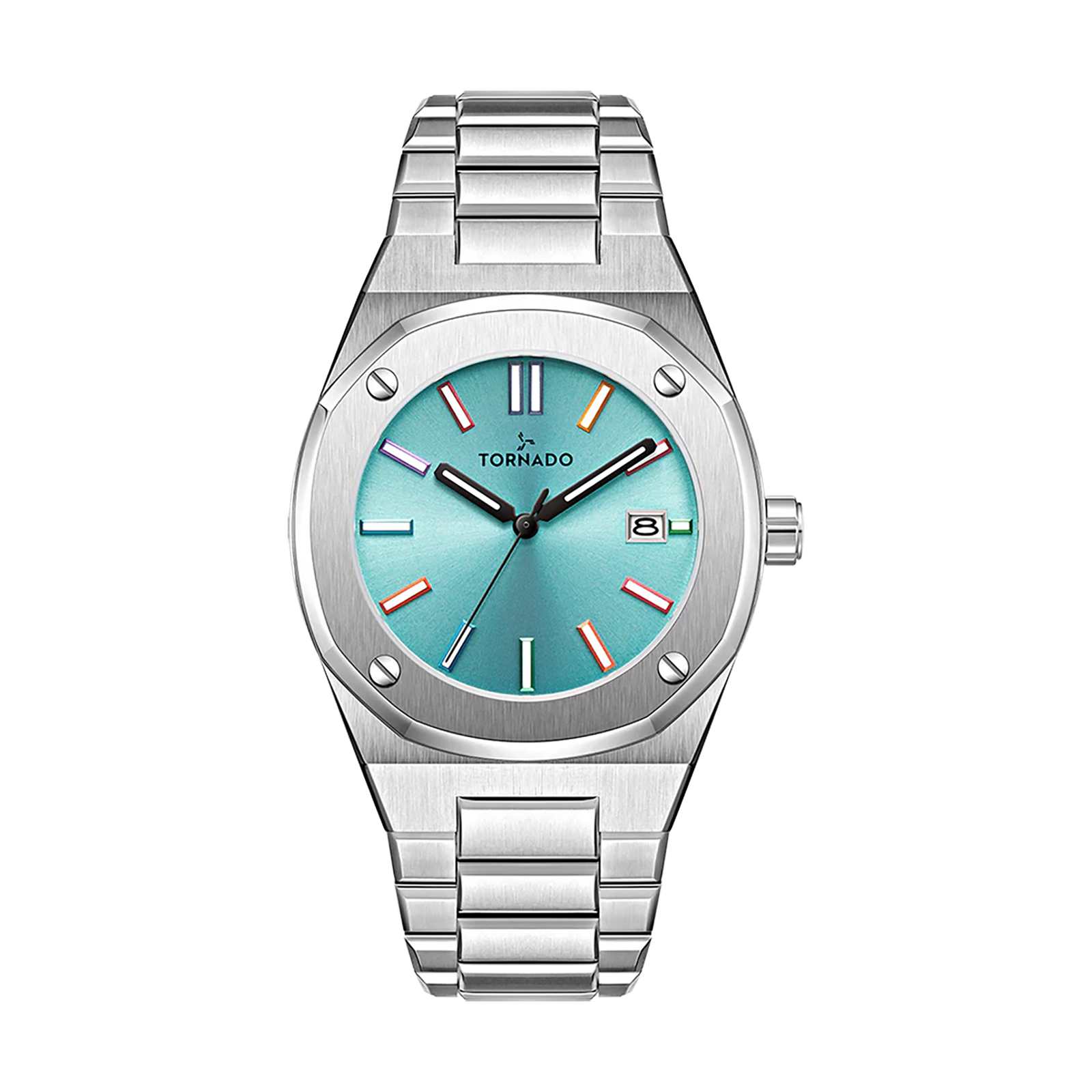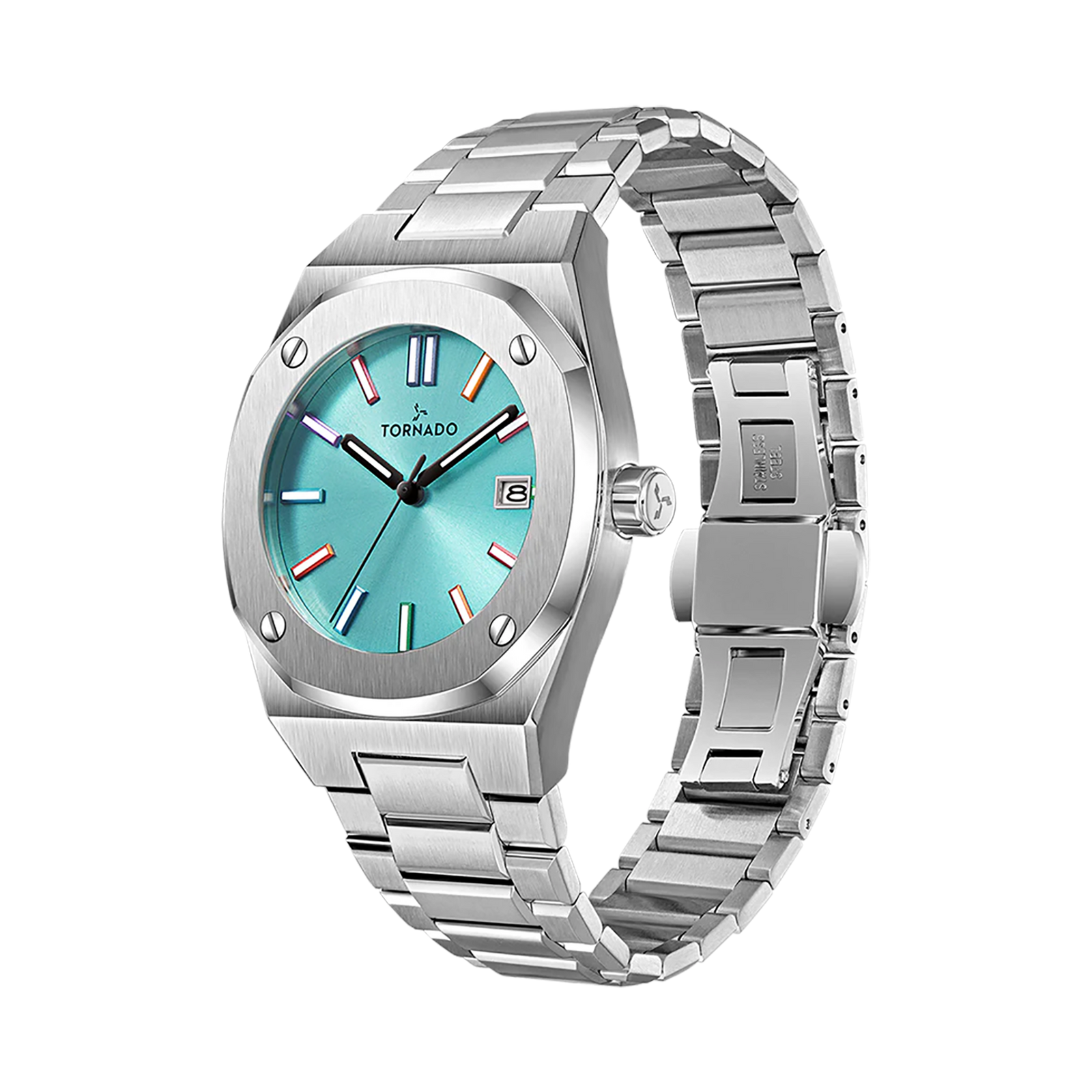 Crisp blue with integrated confidence. Tiffany blue dial luxury stainless-steel watch that blends classic design with a bold, modern color. The sunray turquoise dial with multi-color luminous markers is framed by a 316L stainless-steel case and smooth octagonal bezel, polished along the sides and vertically brushed on the top. Its integrated three-link 316L stainless steel bracelet uses solid links that are brushed on the surface and beveled and polished on all four sides, so the bracelet drapes comfortably and catches light from every angle, secured by a solid stainless-steel butterfly clasp. With a Japanese Miyota 2315 quartz movement and date display, sapphire-coated glass and 10 ATM water resistance, this Tornado men?s watch is a standout piece for casual days, nights out and weekend travel.