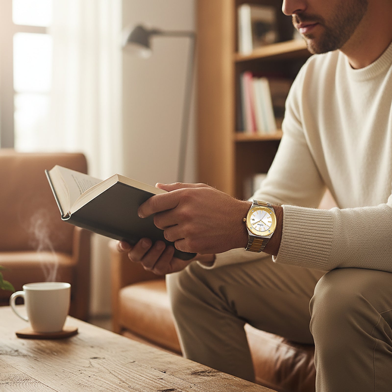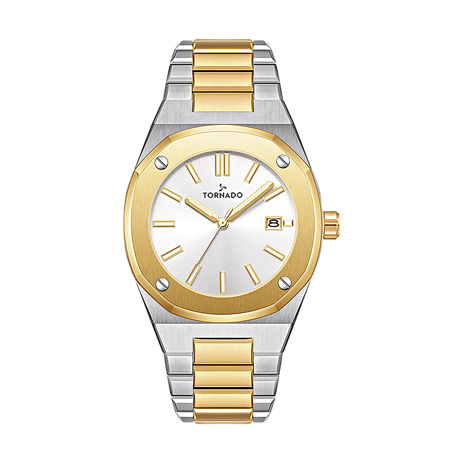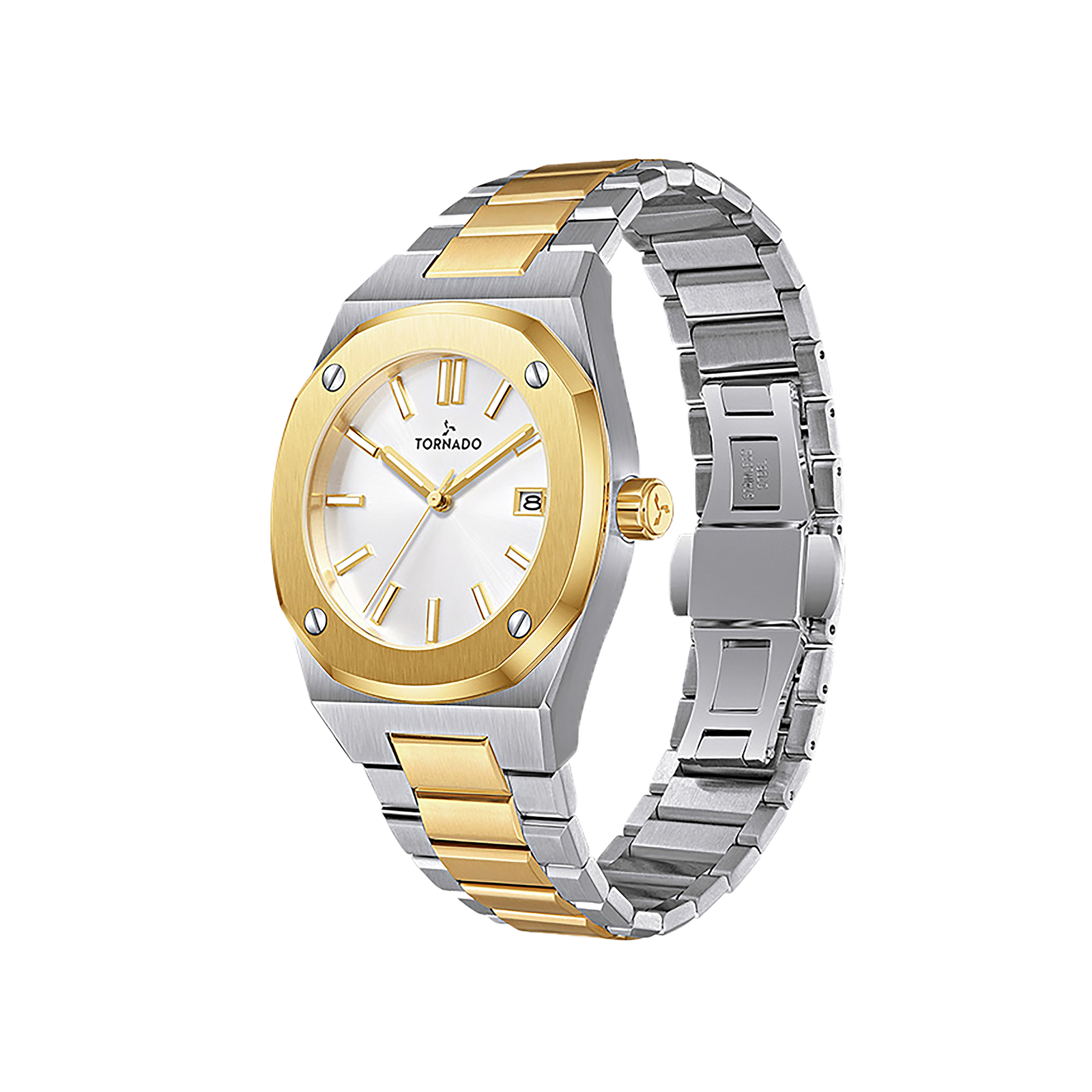 Steel and gold-tone detail bring dress polish to Aurora?s angular case. A men?s two-tone gold and silver luxury stainless-steel watch created for big moments and everyday confidence. The silver dial with gold-tone details is housed in a 42mm 316L stainless-steel case with a smooth octagonal bezel, polished along the sides and vertically brushed on top for a high-end finish. Its two-tone three-link 316L bracelet features gold center links and steel outers, each solid link brushed on top and beveled and polished on all four sides, giving a continuous, jewelry-grade look around the wrist, secured by a solid stainless-steel butterfly clasp. With a Japanese Miyota 2315 quartz movement and date, sapphire-coated glass and 10 ATM water resistance, this Tornado men?s watch is ideal for promotions, weddings, anniversaries and as a standout everyday dress watch.