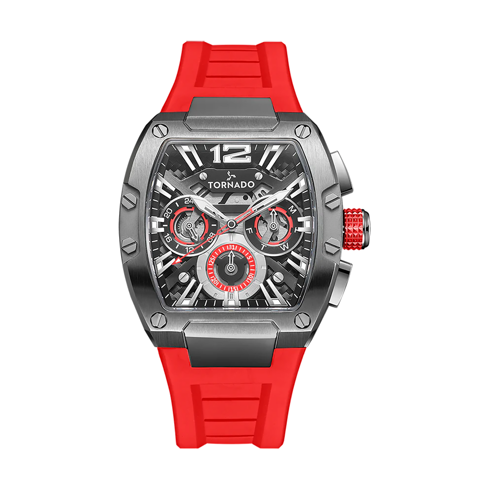 Command attention without trying. Tornado Xenith in red blends performance and polish: a sculpted 43mm tonneau shaped case in 316L solid stainless steel, layered dial, and confident color. The sapphire coated glass keeps the view crisp while luminous details glow after dark. Inside, the Japanese quartz multi function movement (Seiko VX9J) runs quietly and accurately. From campus to boardroom. Perfect for college students, young professionals, executives and mature style. Pair with black, white, grey, beige/khaki and all denim; the red strap adds a sharp highlight to blazers, knit polos and weekend jackets. A premium tornado mens watch built to be your daily driver.