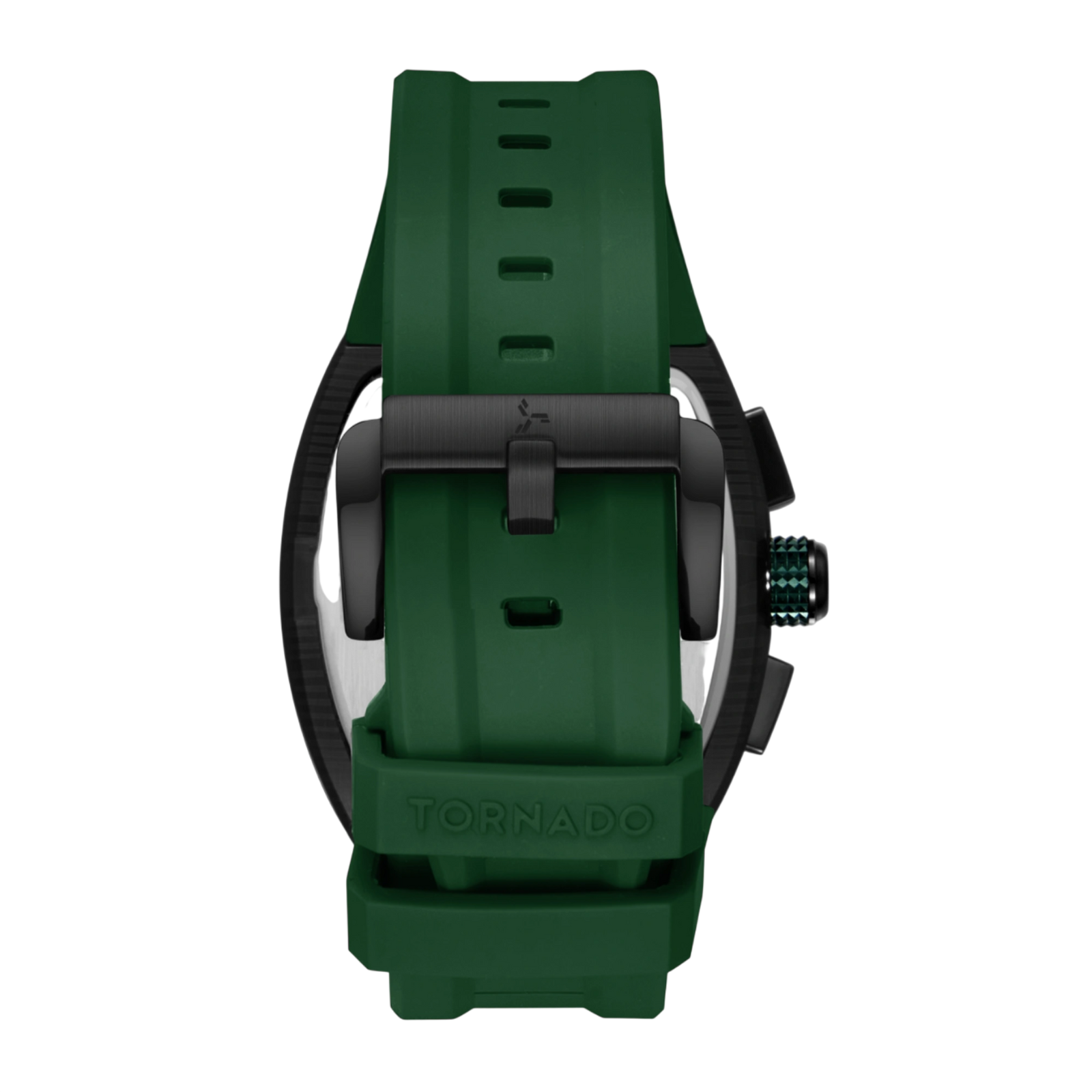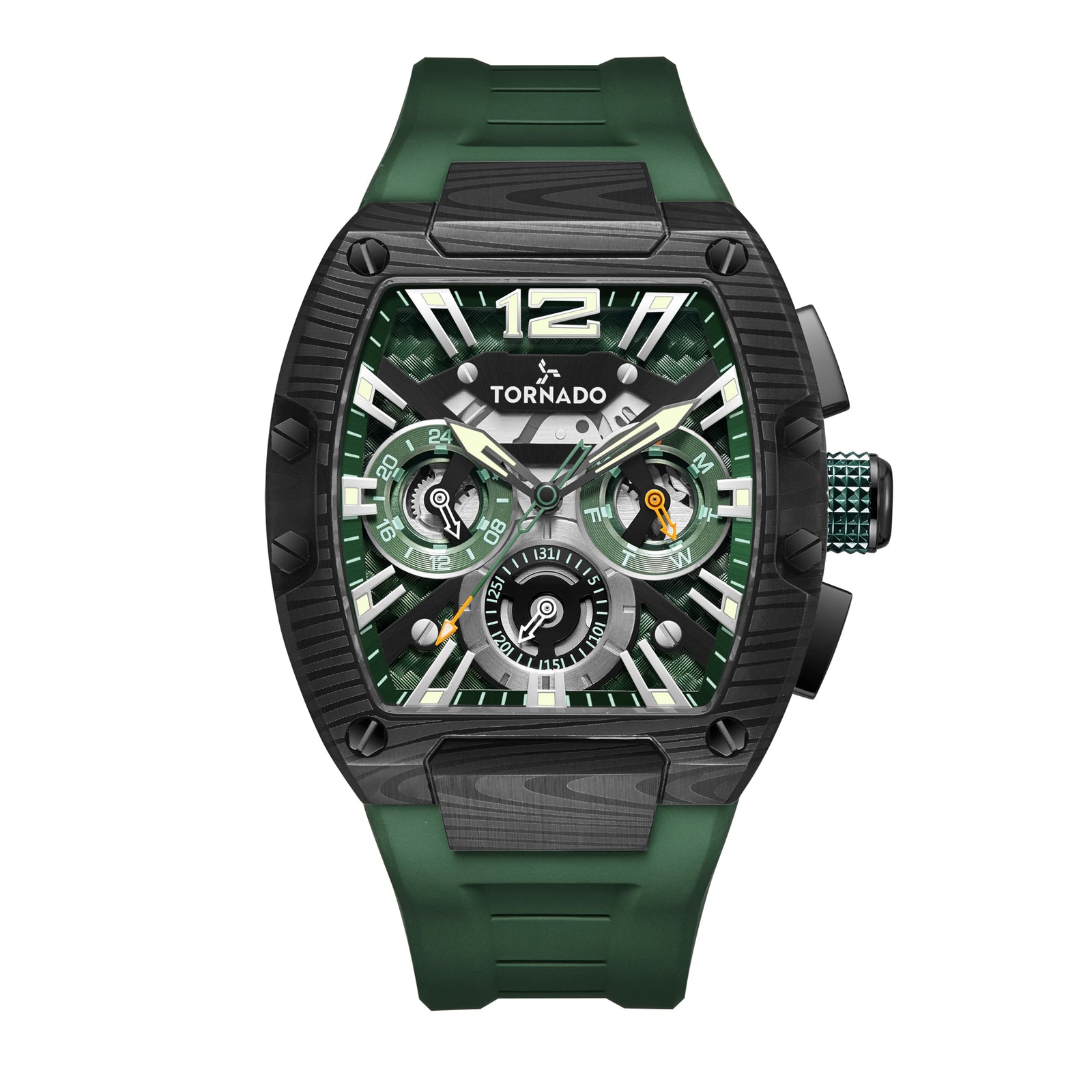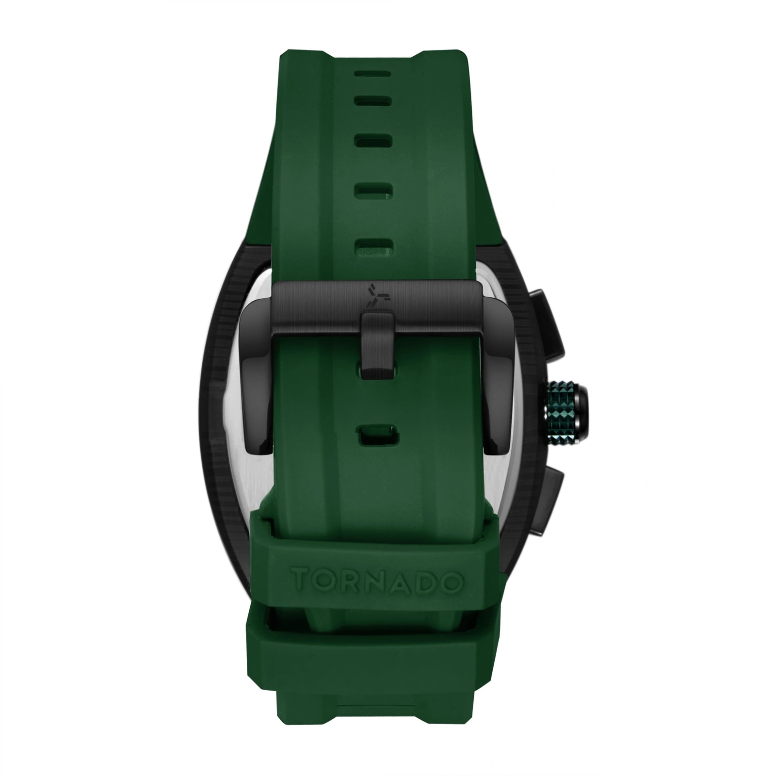 This Xenith variant offers the tonneau case in brushed solid stainless steel, finished in deep black. The black dial complements the case and is protected by a sapphire crystal for everyday scratch resistance. Its chronograph layout is driven by the Seiko VX9J movement, offering reliable timekeeping and multifunction usage for years to come. A green FKM rubber strap adds a strong contrast to the dark case and dial, while bringing in flexibile, durable comfort. The strap tapers from 27.5 mm to 22 mm and secures with a classic tang buckle. With 10 ATM water resistance and a three-year warranty, this model blends sport-ready toughness and aggressive styling, making it a confident choice for active wear and casual settings alike.