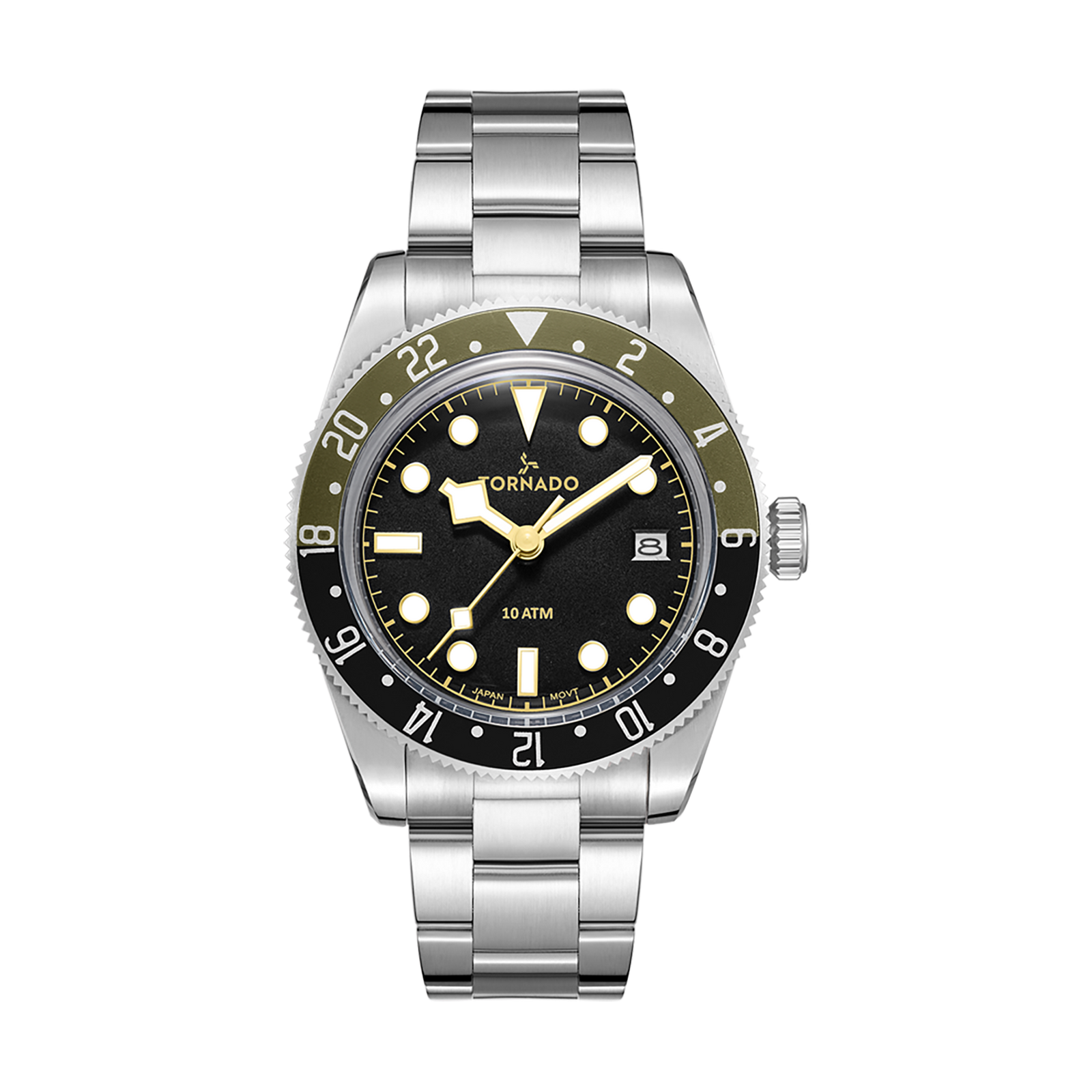 The Tornado LUMINA DATE in silver with a military green and black bi-color bezel leans into a more tool-driven character while keeping its proportions tight. The sand-textured black dial softens reflections and adds depth, while luminous markers and hands stay clear in low light. The dial includes a date display at three o’clock, and is well guarded by Sapphire-coated glass. The 40 mm case is crafted from solid 316L stainless steel and finished in a vertical brush, giving the watch a purposeful, understated surface. A matching stainless-steel bracelet continues the finish and tapers from 20 mm to 16 mm. With a slim 9 mm case height and a butterfly buckle, the watch sits comfortably on the wrist. Powered by the Japanese Miyota 2315-3H quartz movement and rated to 10 ATM, the Lumina Date comes with a three-year warranty, and delivers a balanced blend of utility and refinement.