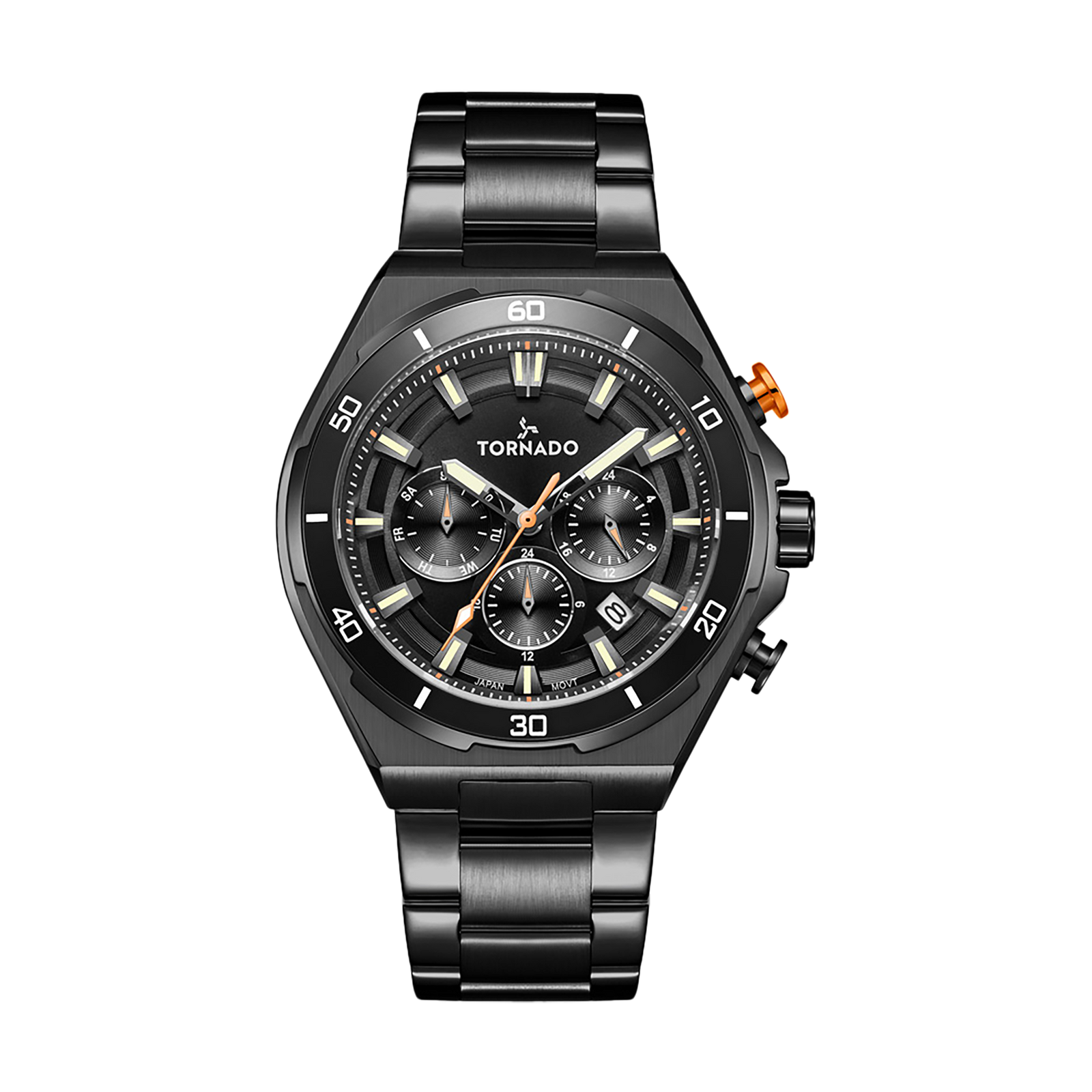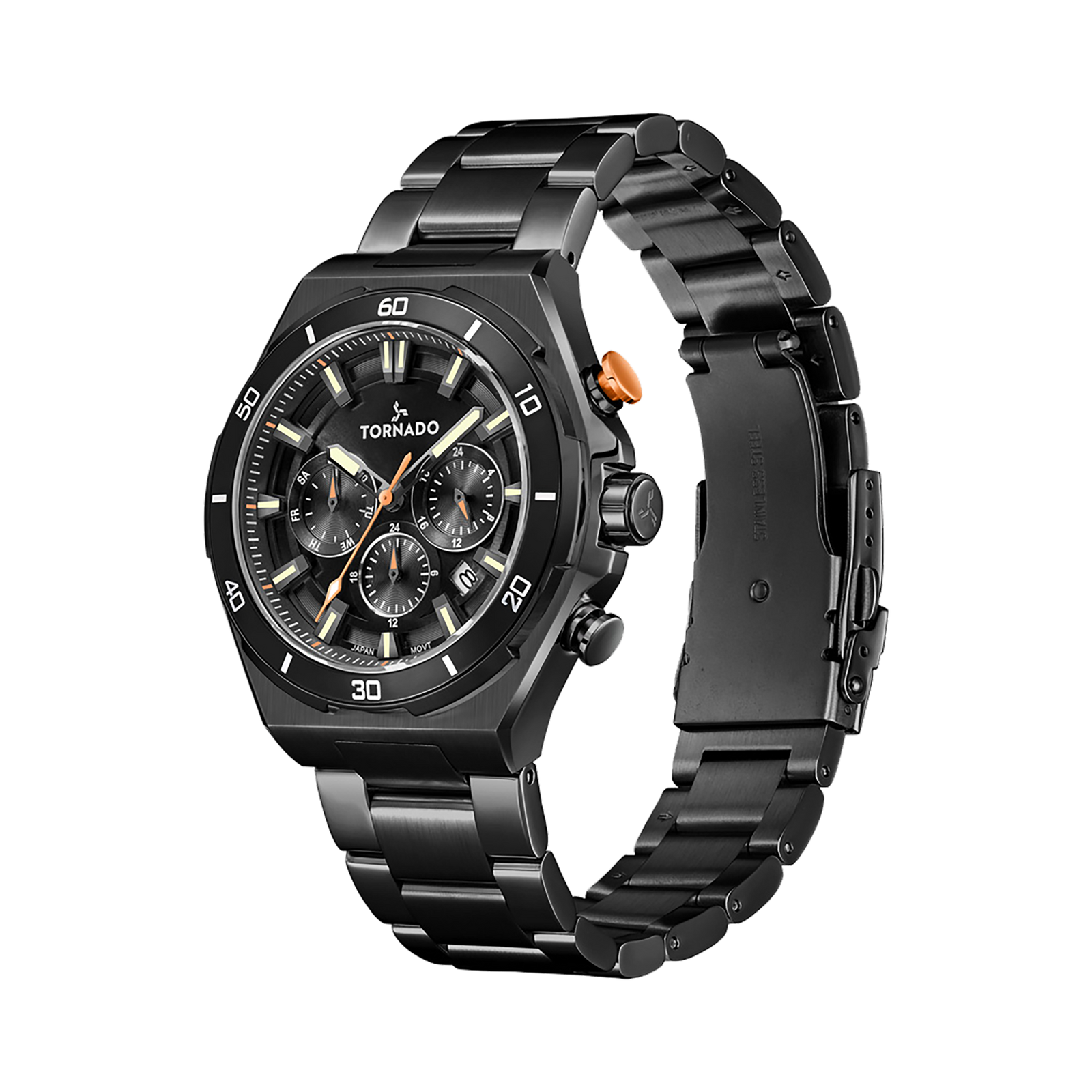 The STELLAR X in black is a dark, assertive take on a modern chronograph watch. Finished entirely in black, the watch leans into scale and surface. The 45 mm round case has a solid feel on the wrist, shaped in 316L stainless steel and given a restrained mix of brushed and polished finishes that catch light without breaking the overall tone. The black sunray dial adds depth through texture. Luminous indices and hands rise cleanly from the surface, keeping the display legible while preserving the watch’s monochrome character. The multi-function layout is neatly integrated without compromising legibility. A matching stainless-steel bracelet reinforces the watch’s weight and presence. Polished outer links frame brushed centre links, creating a subtle rhythm across the wrist. The butterfly buckle keeps the profile tidy when closed. Powered by the Miyota JP25 movement, protected by sapphire-coated glass, and rated to 10 ATM, Stellar X is built to feel deliberate, bold, and self-contained.
