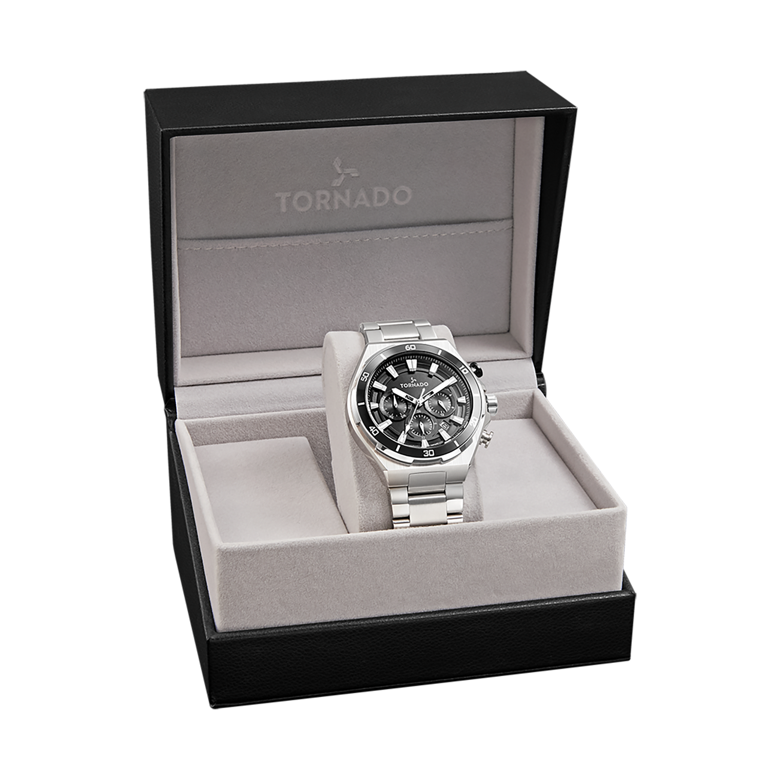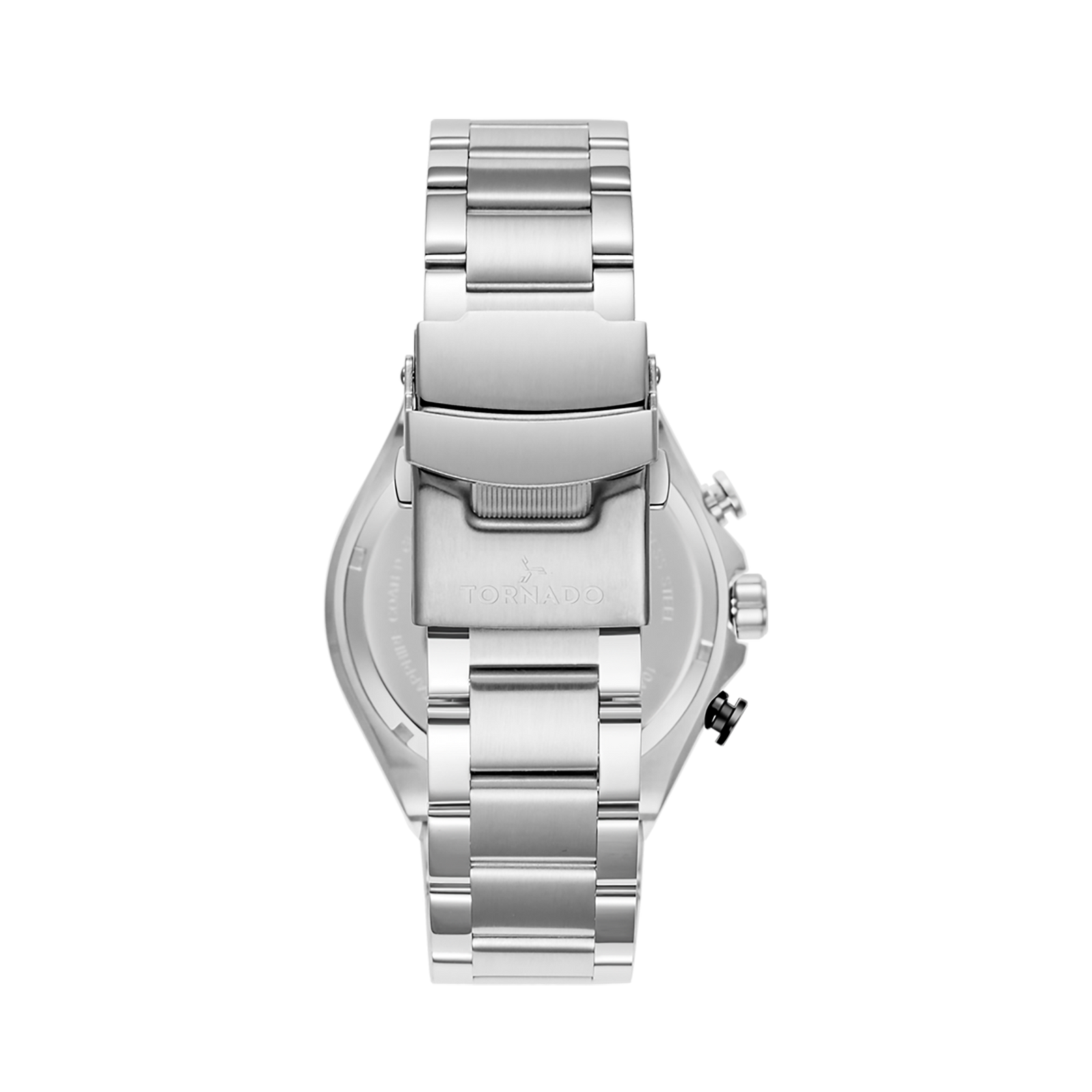 In silver and black, this version of the Stellar X sports a 45 mm stainless steel case with polished outer links framing the bracelet, and brushed centre links that mute reflections. The black sunray dial is deliberately understated. Light plays subtly across its surface, adding depth without affecting legibility. Luminous indices and hands stand out cleanly, giving the dial a sharp, purposeful layout that suits the multi-function display. Every component feels considered: the butterfly buckle maintains a continuous line around the wrist, and the sapphire-coated glass keeps the dial clear and protected. Powered by the Miyota JP25 movement, this Stellar X is defined by proportion and finish, offering a confident, no-nonsense expression of the multifunction design.
