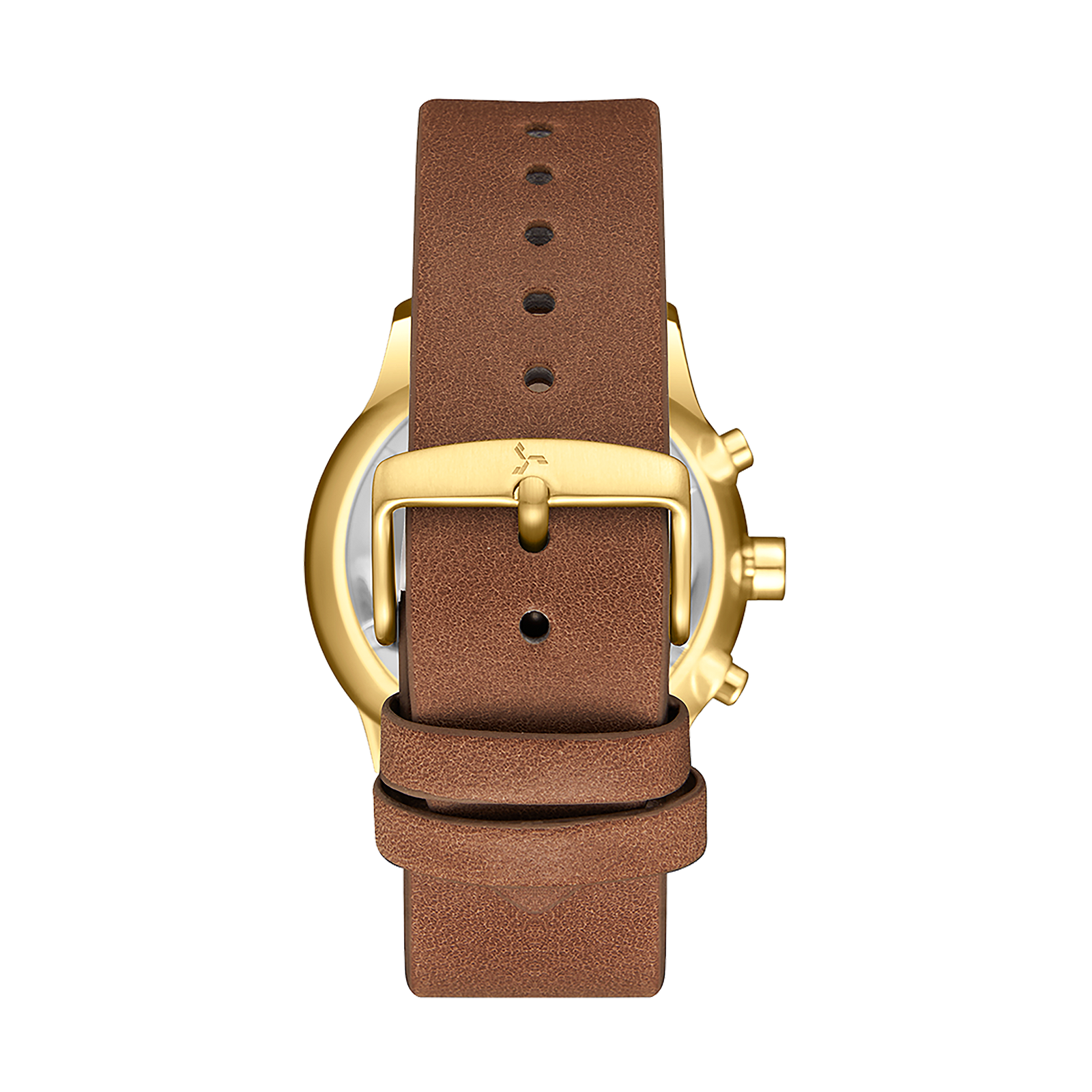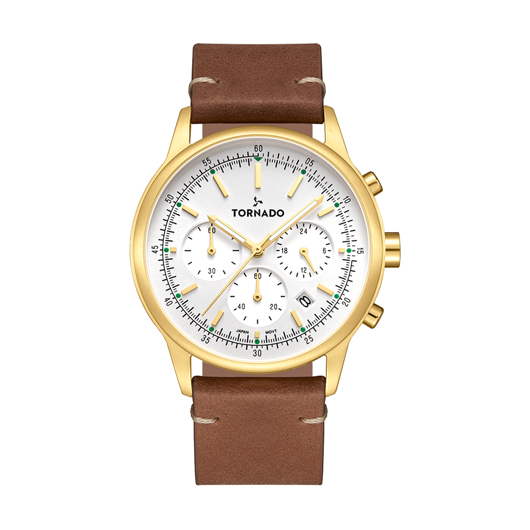 Refined multi-function watch with white sunray dial and gold case paired with brown leather strap. Powered by Seiko VD53 movement, sapphire-coated glass, luminous markers, and 5 ATM water resistance.