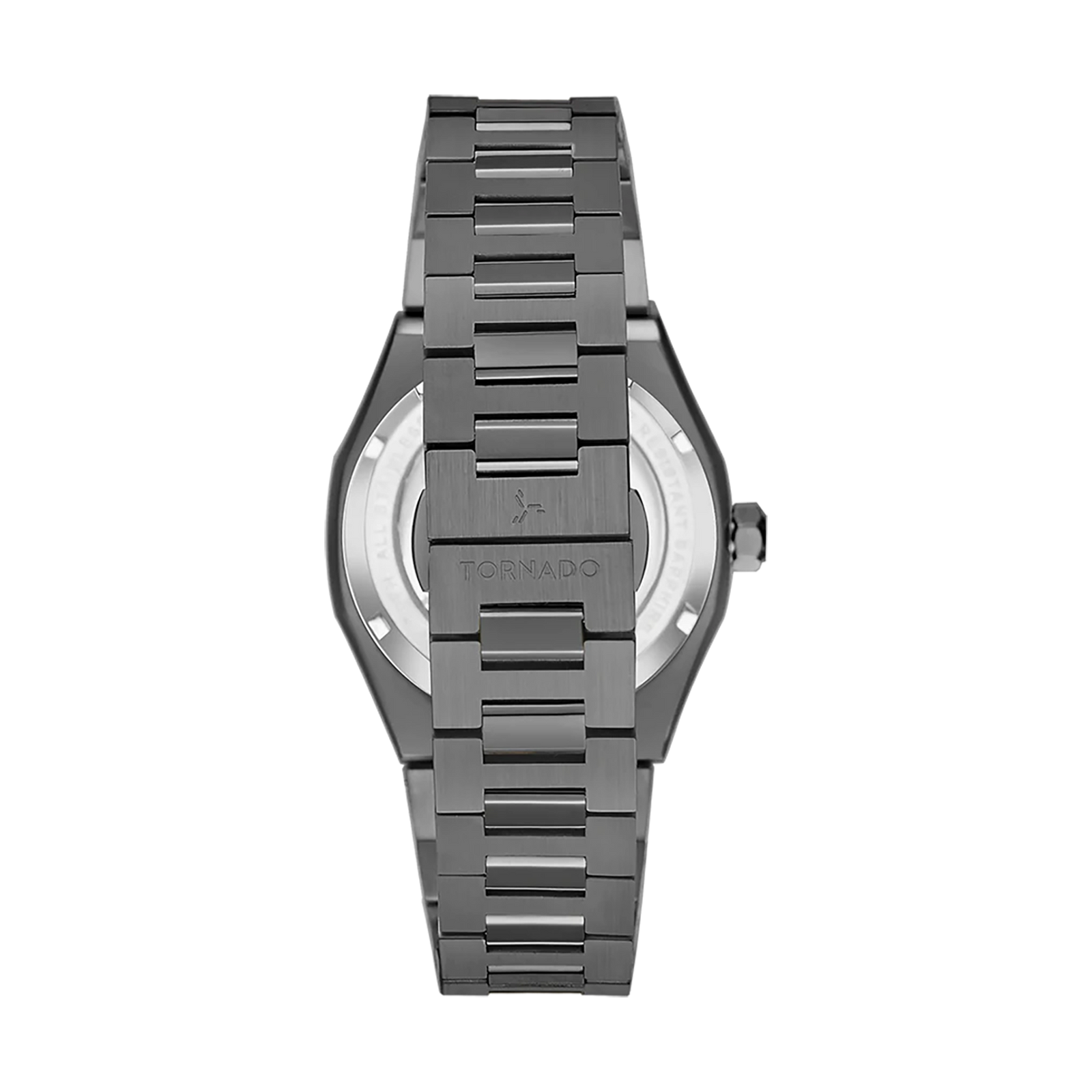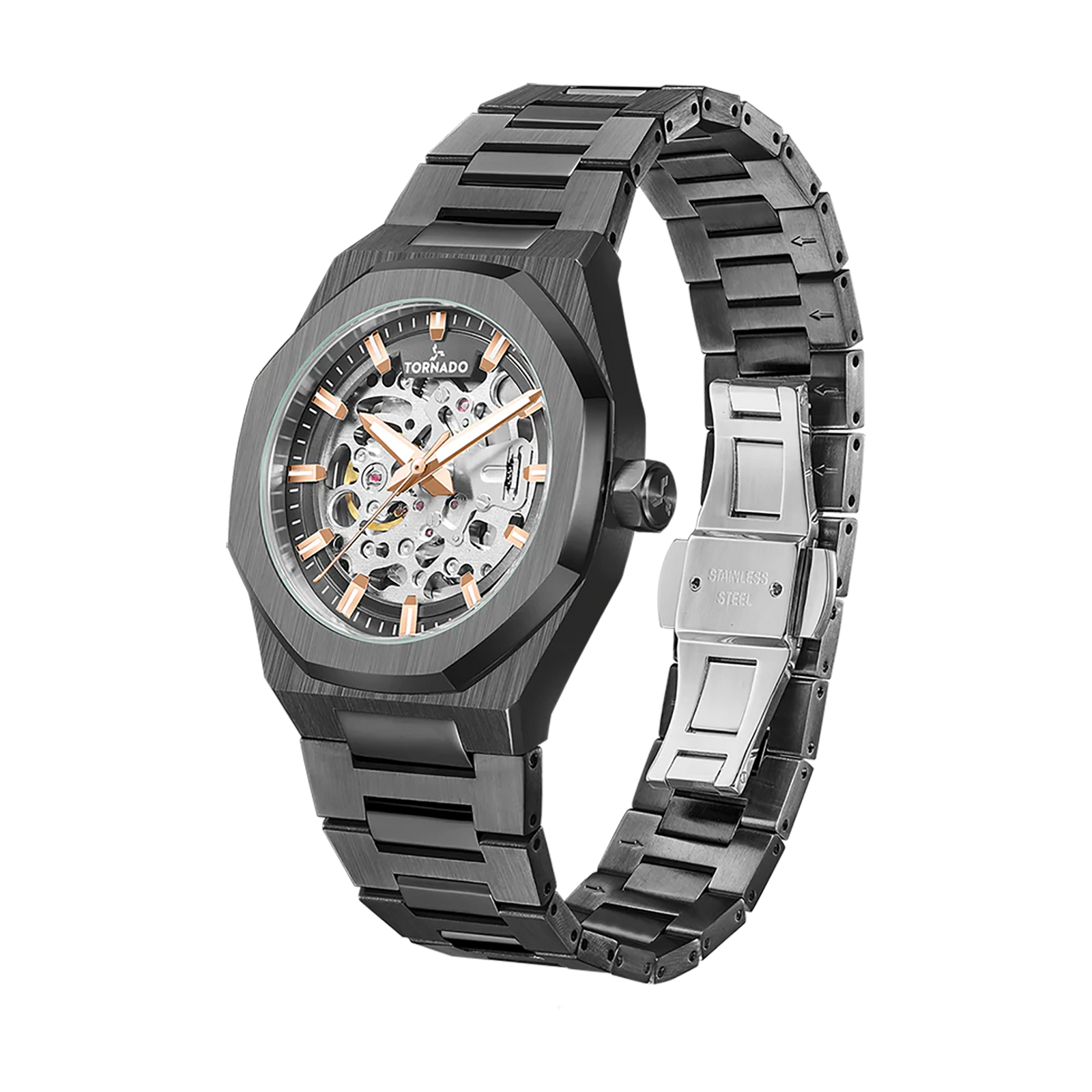 The all-grey AUTONOVA Automatic is built around a 41 mm case crafted from brushed 316L stainless steel, combining a round body with a sharply defined octagonal bezel. The monochrome finish gives the watch a restrained, industrial character, while the 10 mm case thickness keeps the profile comfortable for daily wear. The skeleton dial is rendered in matching grey tones, leaving the mechanical architecture fully exposed. Beneath sapphire-coated glass, the Miyota 8N24 automatic movement remains in constant view, with bridges, gears, and balance creating depth and motion across the open-worked display. An integrated stainless-steel bracelet completes the design, finished with brushed outer links and polished centre links to add subtle contrast. The bracelet measures 27 mm at the case and tapers to 18 mm at the butterfly clasp, maintaining a seamless flow from case to wrist. With 10 ATM water resistance and a three-year warranty, this model emphasizes mechanical transparency, durable construction, and a cohesive tonal finish suited to a modern automatic timepiece.