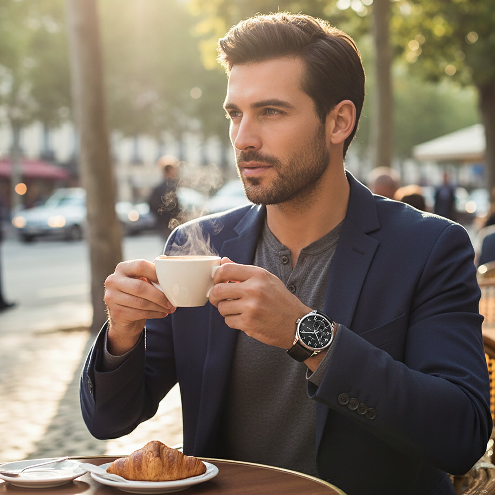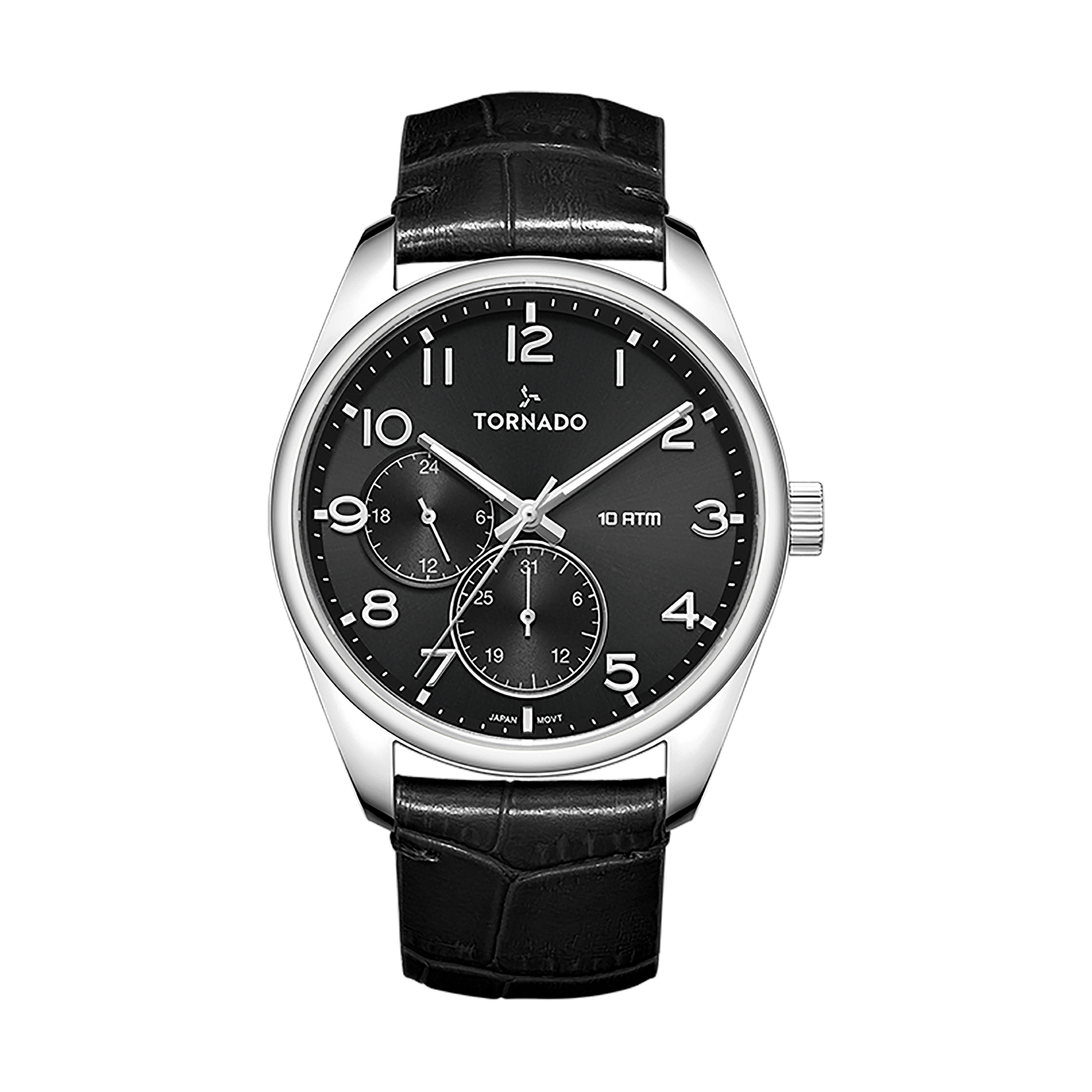 Sophisticated black dial multi-function watch with silver case and black leather strap. Features Seiko VX7R movement, sapphire-coated glass, and 10 ATM water resistance.