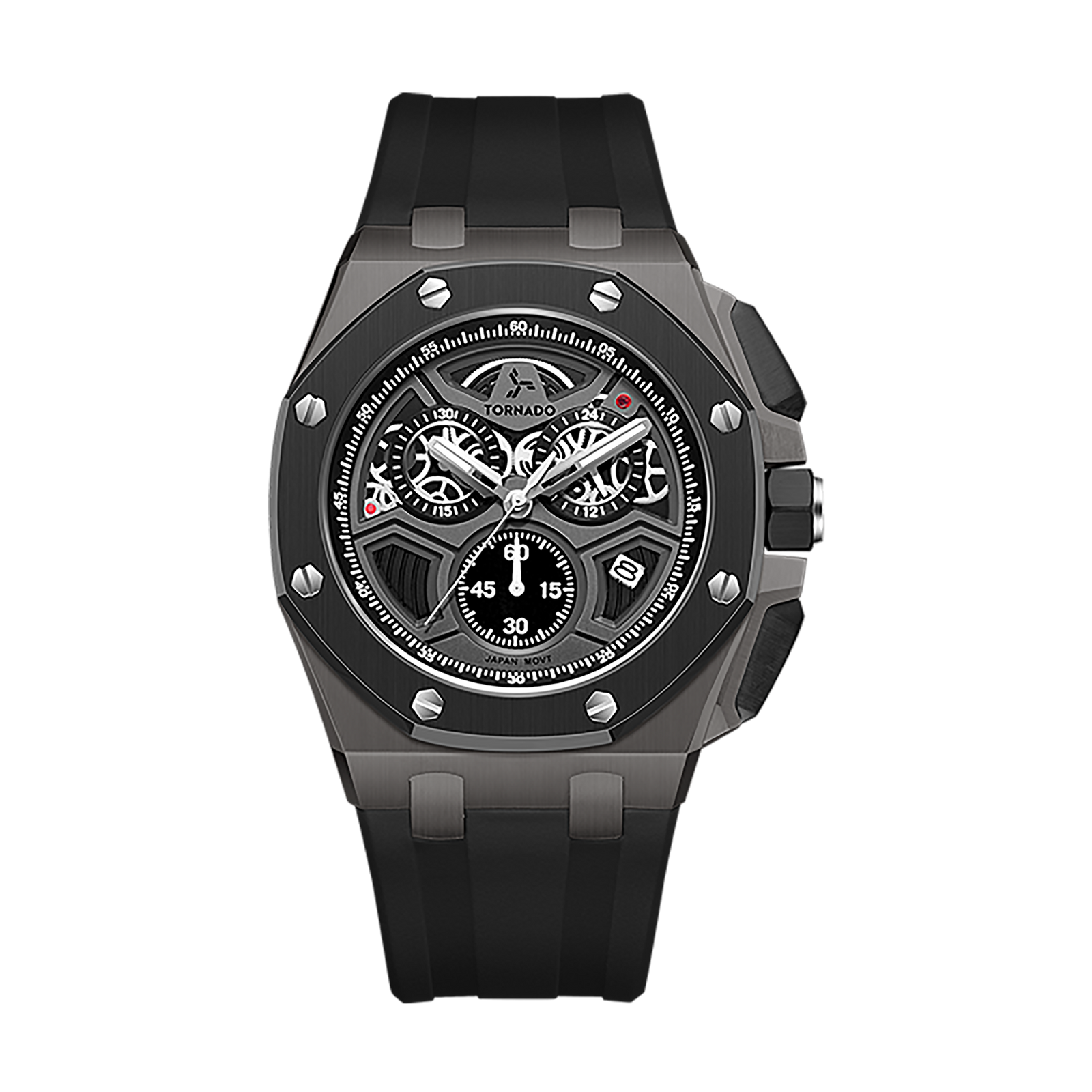 The LUMINA CHRONOSPHERE is built around a 43 mm case crafted from 316L solid stainless steel, finished with a combination of brushed and polished surfaces that give the watch depth without visual clutter. The round case is sharpened by an octagonal bezel, while a sapphire-coated glass protects the dial. The dial itself is finished in black and laid out to support the chronograph display. It is driven by the Miyota JS05 movement, a dependable chronograph calibre that delivers precise timekeeping and functional stopwatch performance. With a water resistance rating of 10 ATM, the watch is well suited to daily use and active settings, providing confidence beyond occasional splashes. Completing the design is a black silicone strap selected for flexibility, durability, and comfort over extended wear. The strap integrates cleanly with the case and secures with a butterfly buckle. Measuring 28x24 mm, the strap balances the watch’s substantial case, which measures 12.5 mm in thickness. Finished with a three-year warranty, the Lumina Chronosphere reflects a considered blend of sport-driven construction and refined case detailing.