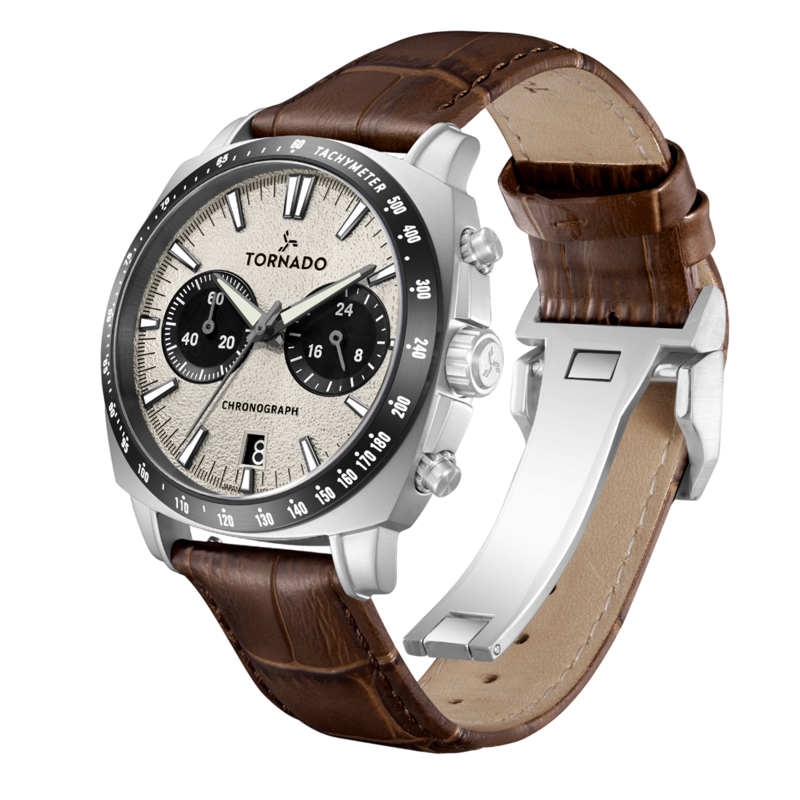 This Tornado Chronograph dress watch is a masterpiece in contemporary classic watch design. The 42 mm case is crafted from 316L stainless steel with a rounded bezel, creating a bold silhouette on the wrist. The case is bound by a genuine leather strap with a crocodile pattern, furthering the classic look, while being closed by a deployant buckle. The dial is finished in ivory with a matte sand-texture, and sits beneath sapphire glass, offering both visual depth and reliable scratch resistance. Movement is powered by the Seiko VK64 chronograph, delivering precise timekeeping and responsive chronograph operation.