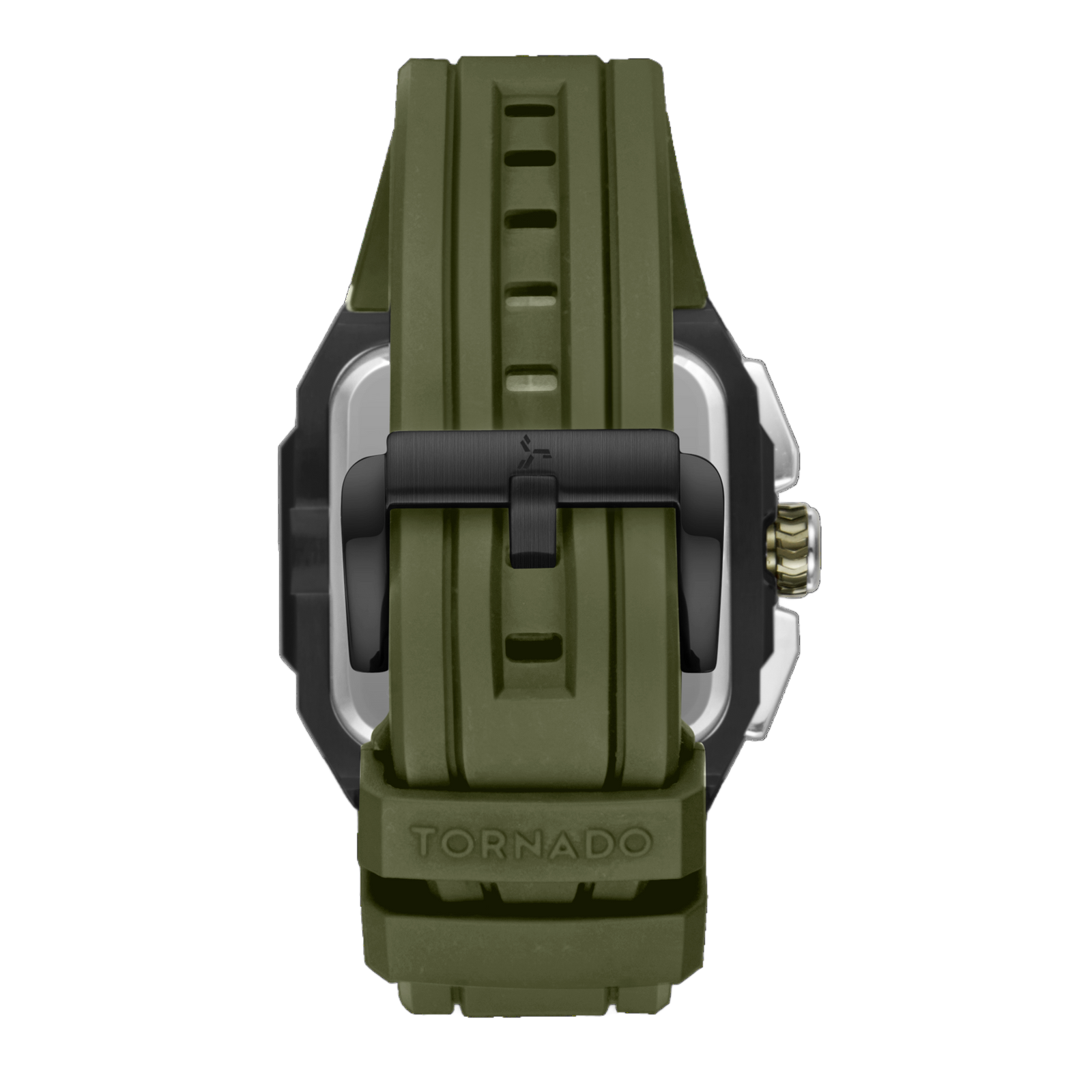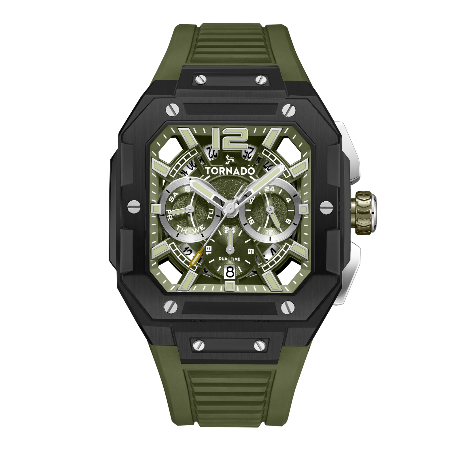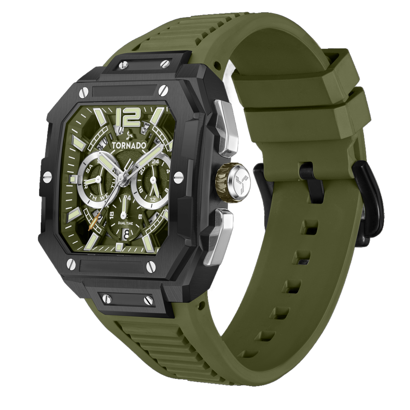 This Xenith Curve model showcases an iconic black-green contrast in a durable build. The 44mm, 316 Stainless Steel case is finished in black and paired with a green FKM strap. Protected by sapphire glass, and matching the strap, the dial is deep green and is powered by a Miyota JP25 movement, with its intricacies showcased with a transparent K9 crystal back cover . The flexible FKM strap offers extreme durability and comfort, and secures with a classic tang buckle.
