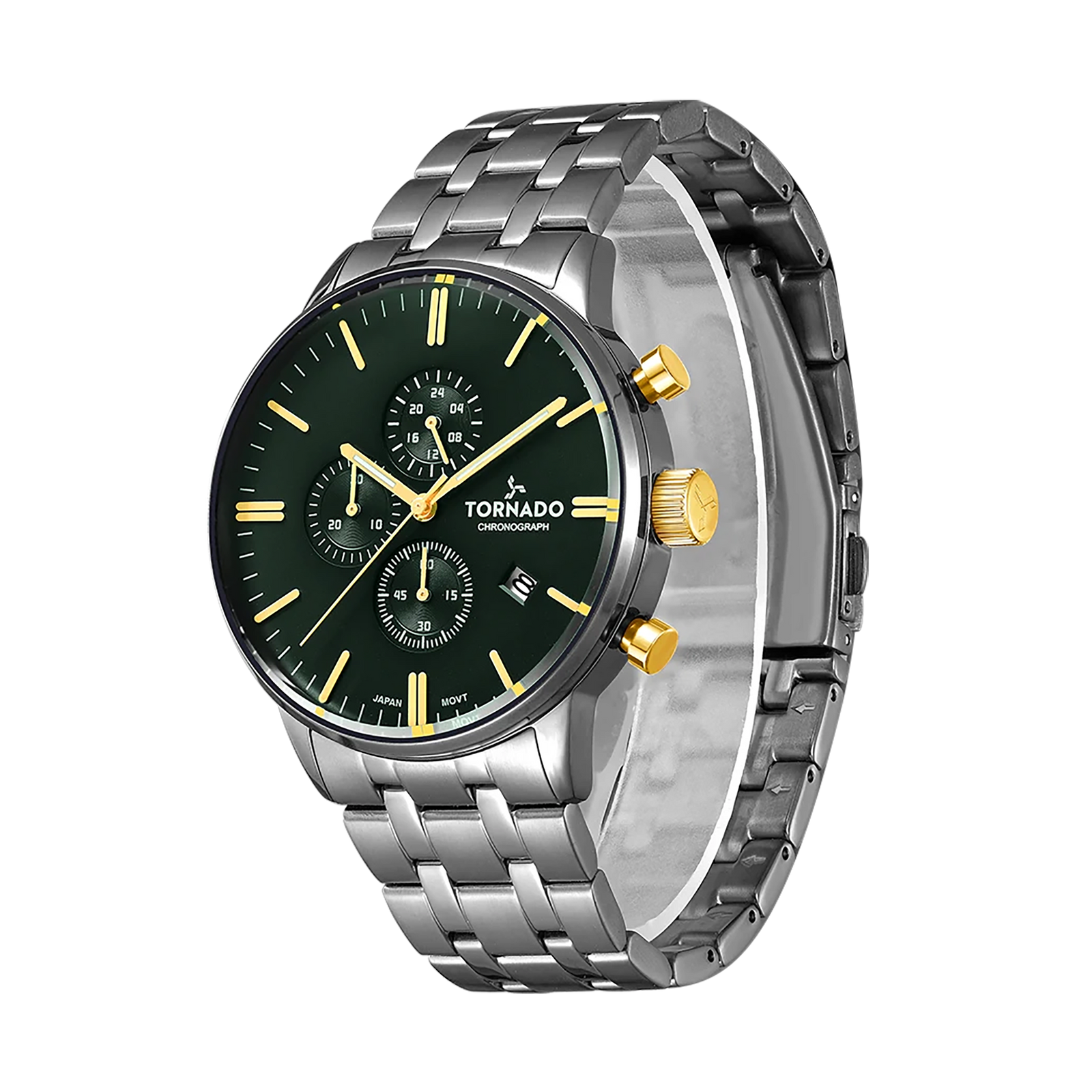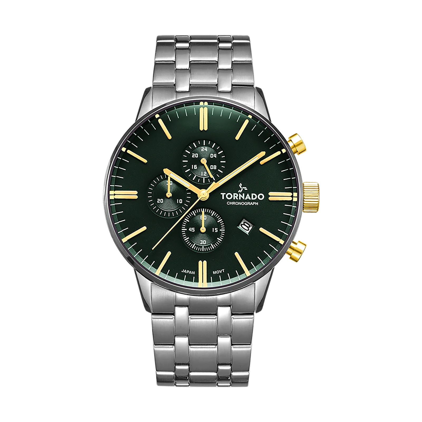 Tornado Celestia Elite Men's Chronograph Watch with green dial, silver case and strap. Japan Quartz movement, sapphire coated glass, 10ATM water resistant. 3-year warranty included.