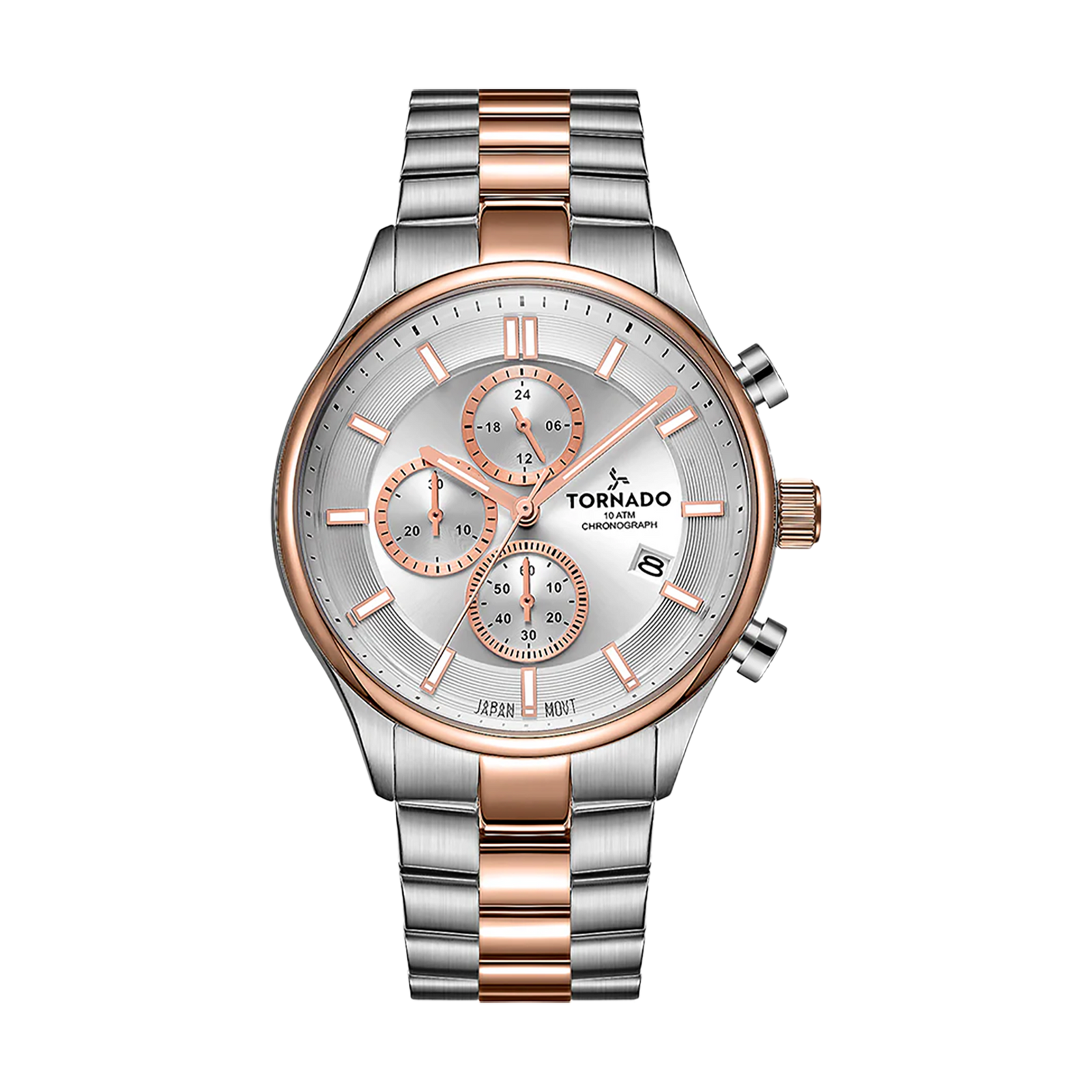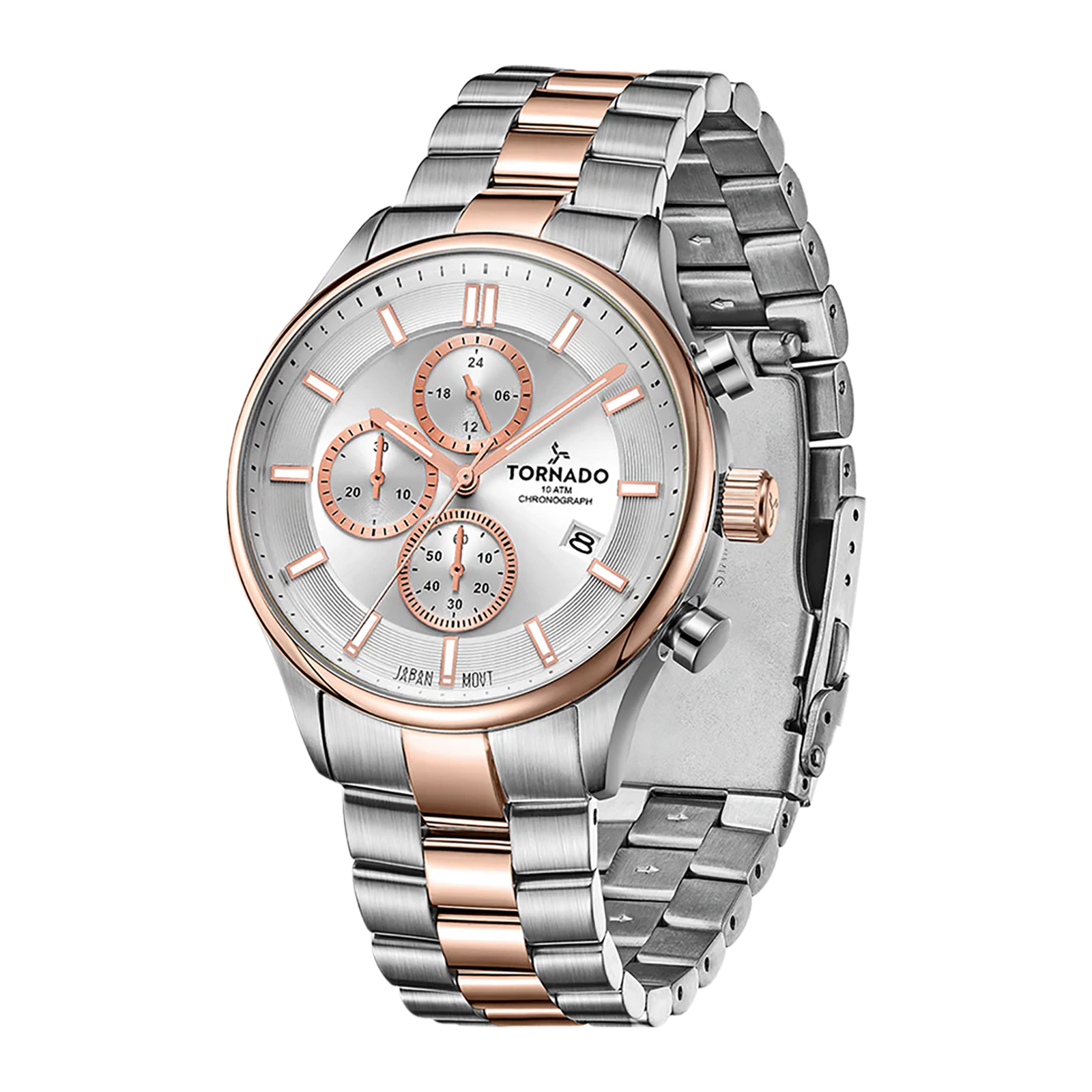 The Tornado Celestia Elite chronograph in two-tone rose gold presents a delicate balance of contrast. The 42 mm round case is formed from solid stainless steel and finished with brushed and polished surfaces, giving structure to the warm rose-gold tone. A matching two-tone stainless-steel bracelet, with polished outer links and brushed centre links completes the structure and closes securely with a solid deployant buckle. The white dial brings clarity and restraint to the design. The clean surface allows the applied markers and hands to stand out, while three chronograph subdials are arranged at 12, 9 and 6 positions respectively. A sapphire-coated crystal protects the dial, chosen for its ability to maintain visual clarity over time. Inside, the watch is driven by the Miyota JS25 chronograph movement, valued for stable performance and dependable timekeeping. With a water resistance rating of 10 ATM, the Celestia Elite is well suited to daily wear and routine exposure to water, in addition to being backed by a 3-year warranty from Tornado.