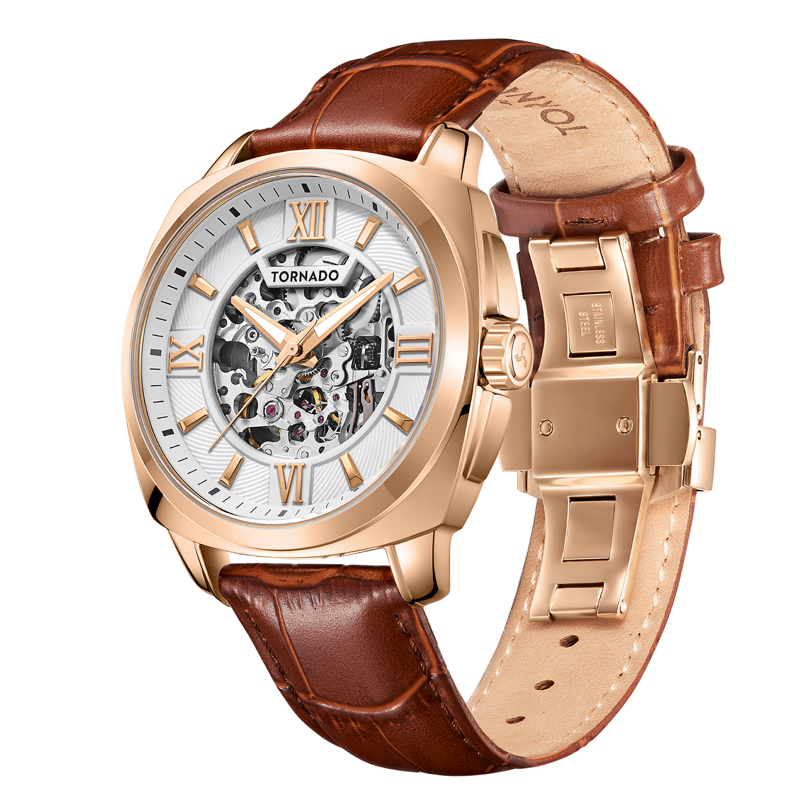 Tornado Autonova Men's Automatic Watch with white dial, rose gold case and brown leather strap. 8N24 automatic movement, sapphire coated glass, 10ATM water resistant. 3-year warranty included.