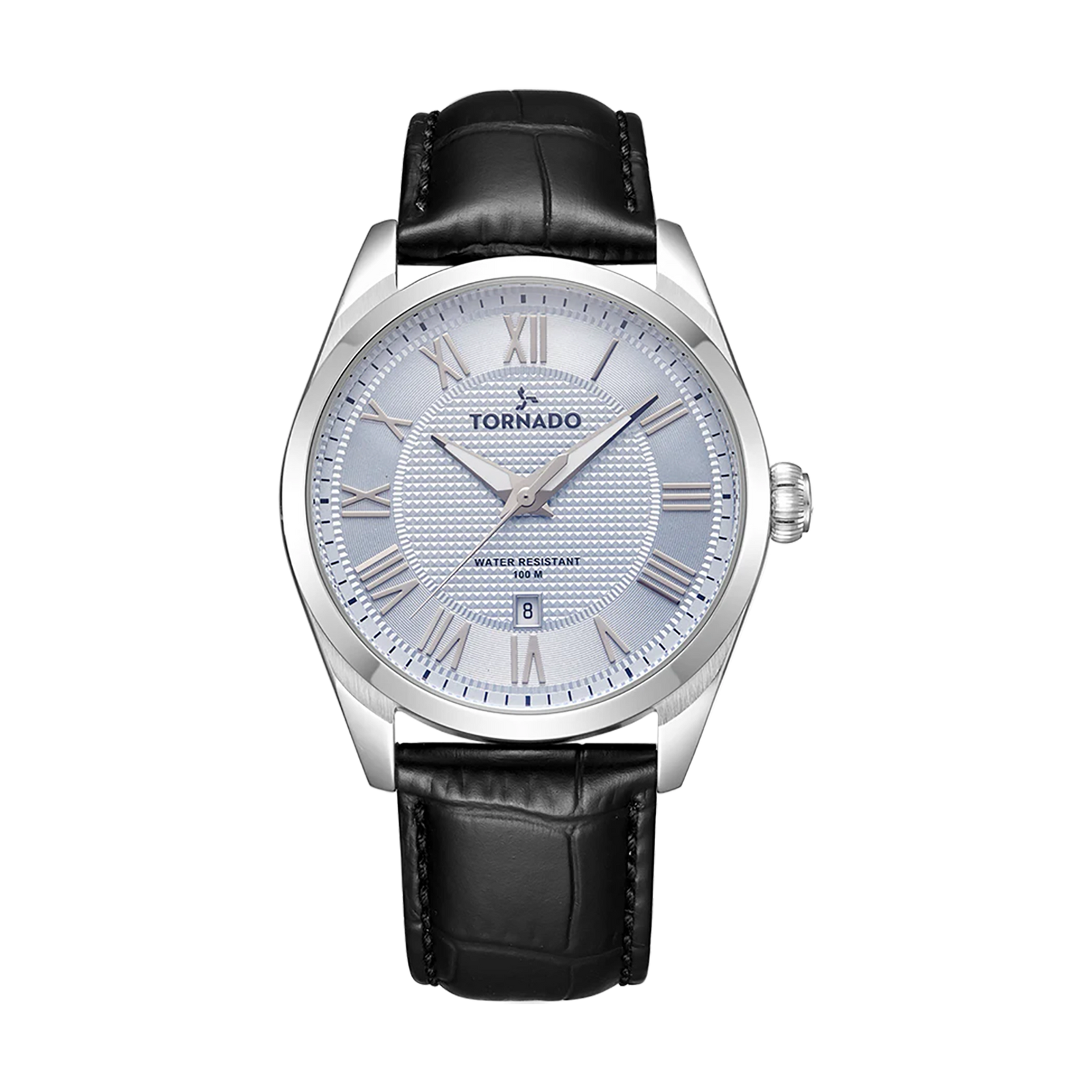 Tornado Celestia Classic's Analog Watch with blue dial, silver case, black leather strap. Japan Quartz movement, slight dome sapphire coated glass, 10ATM water resistant. 3-year warranty included.